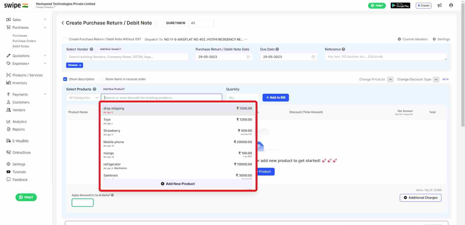 Click on the “Select Vendor” and select the Vendor you want to create the Purchase Return/Debit Note for or create a new Vendor profile by clicking on the “+New” button.
