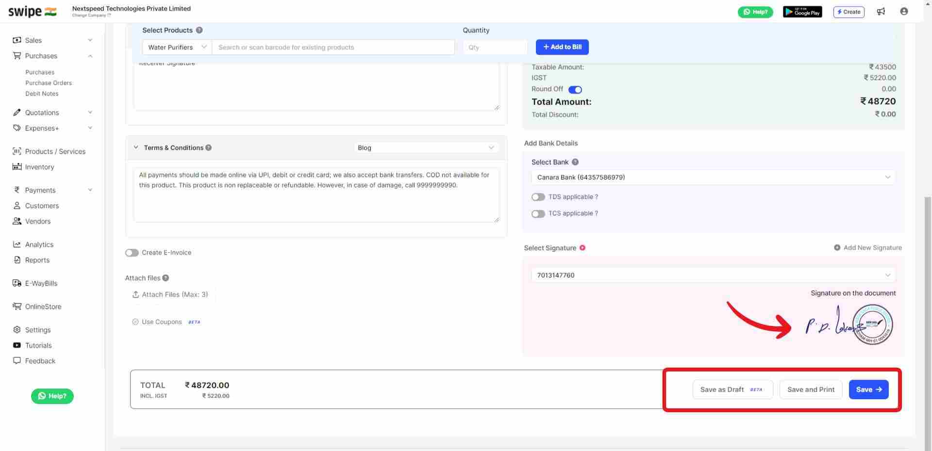 Add additional, delivery or packaging charges (if applicable any) and create or edit the notes as well as terms and conditions.