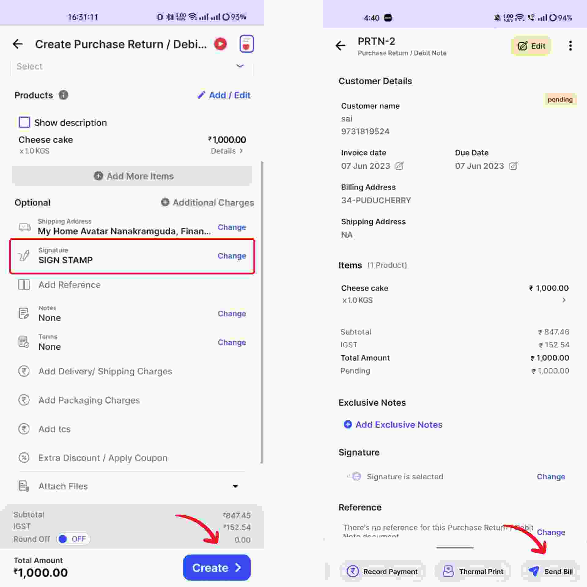 Your Purchase Return/ Debit Notes is ready and you can share it via Whatsapp, SMS or Email to your vendor by clicking on “Send Bill” at the bottom of the page.