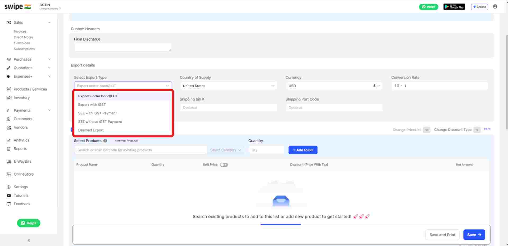 Also, Fill in other required details like Shipping Bill date, Shipping Bill Number, Shipping Port code, Country of Supply, Currency, Conversion rate, etc.