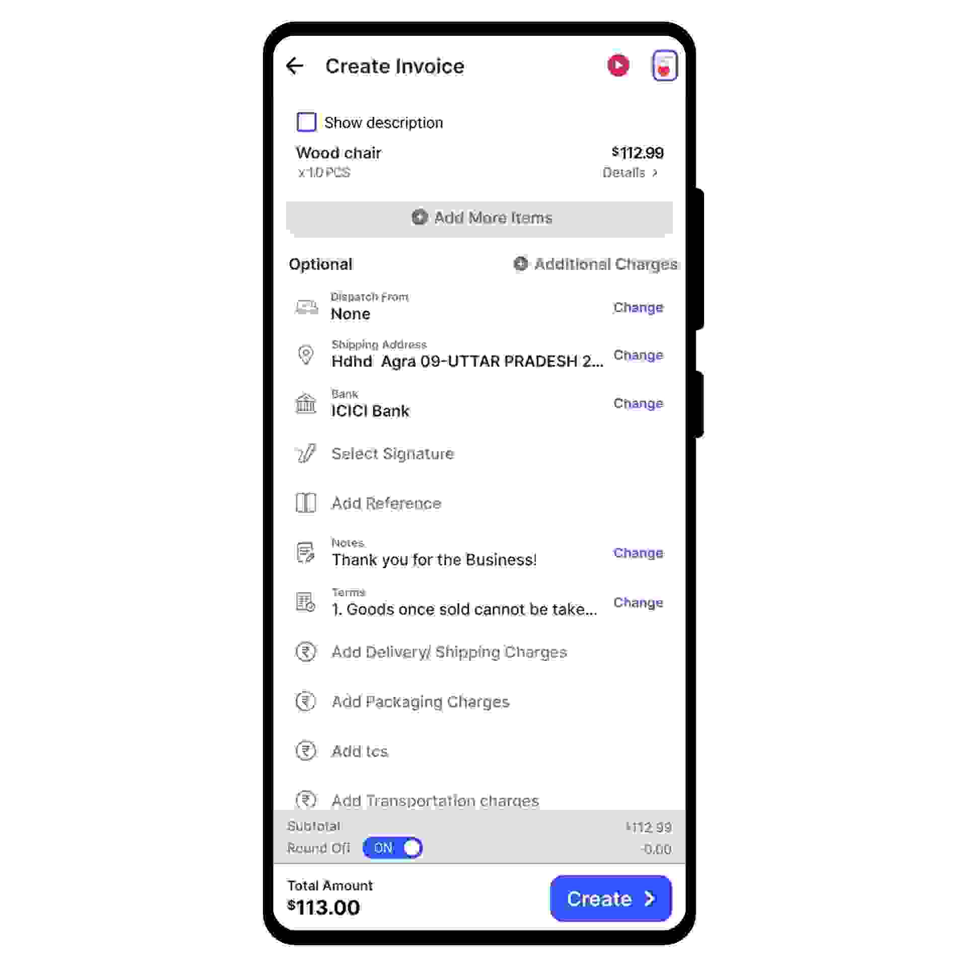 If applicable, add additional delivery or packaging charges. You can also create or edit the notes as well as the terms and conditions.