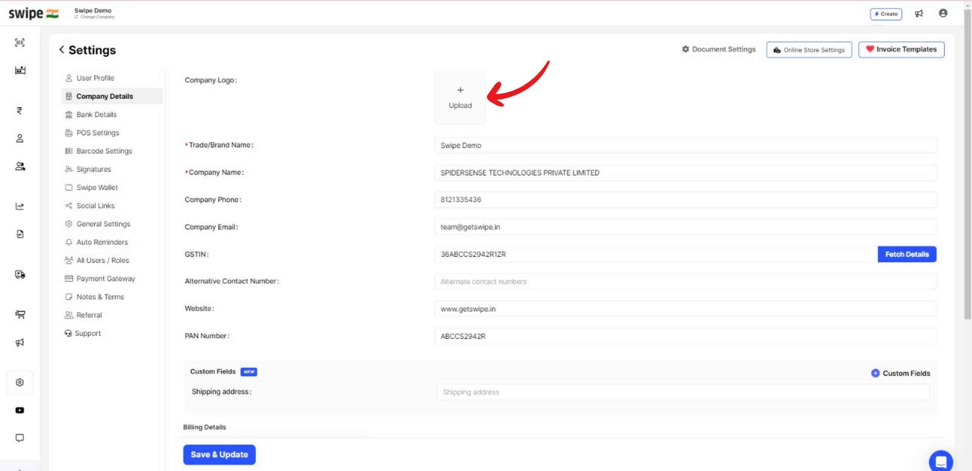 Click on the “Settings” icon on the left dashboard and Select the “Company Details” option from the menu.