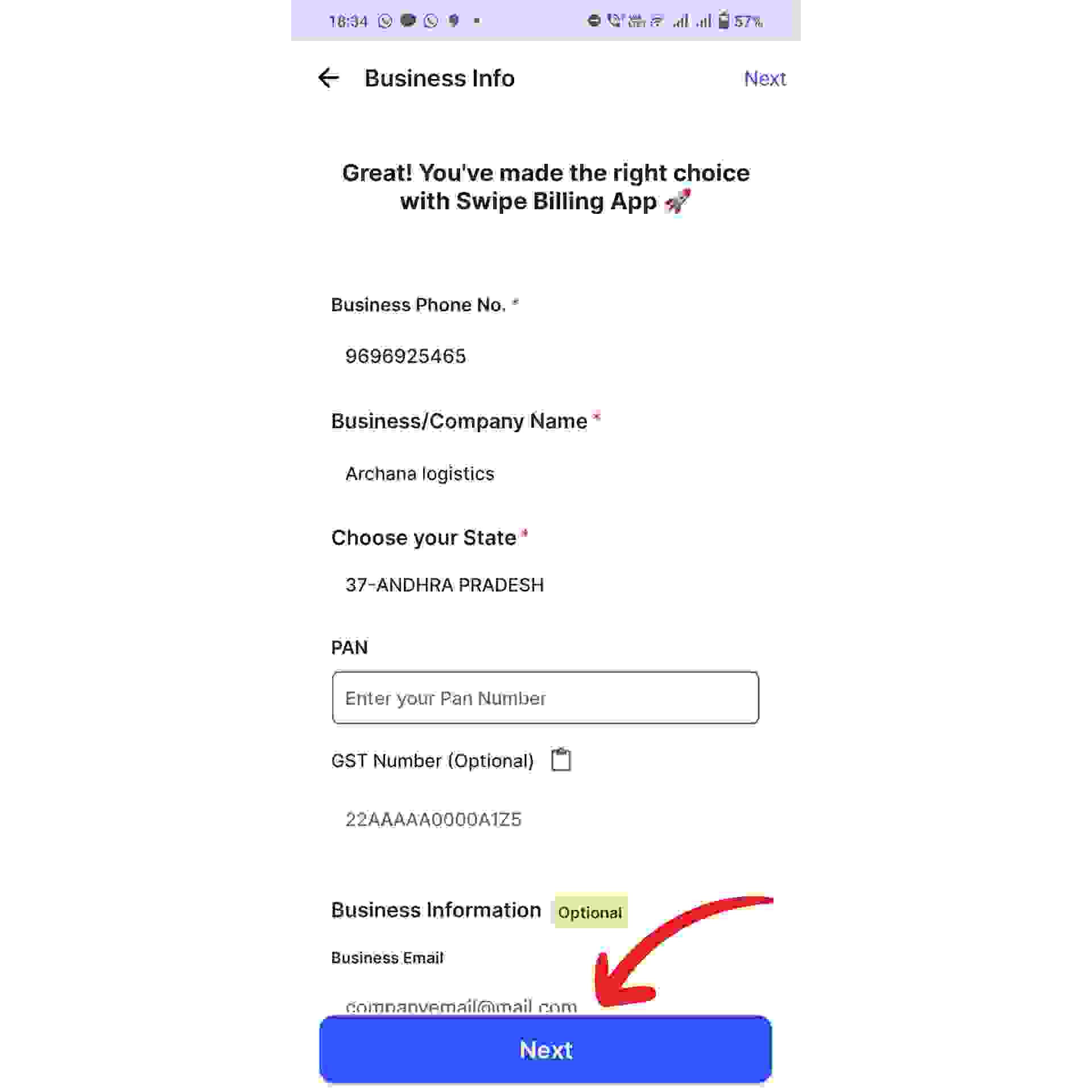 Now, fill in necessary business details, like company name, contact number, state, PAN number, etc