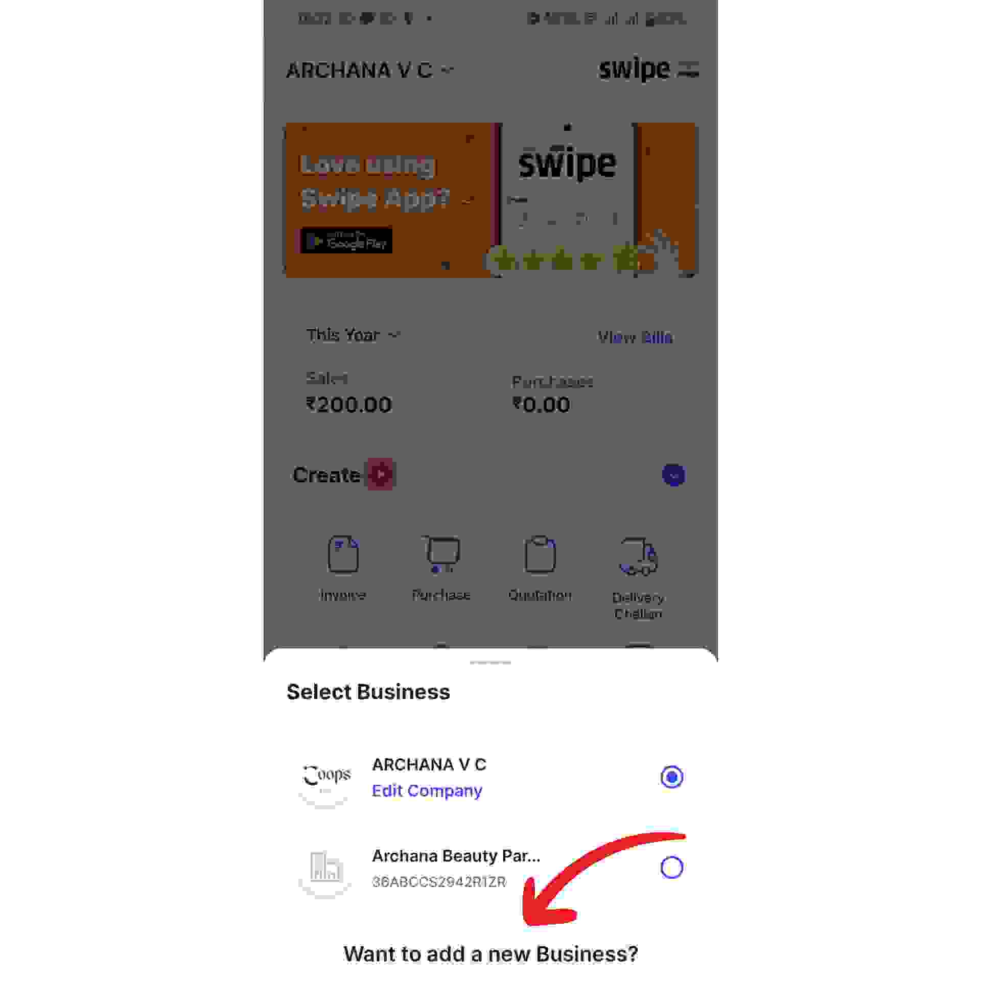 As soon as you click on your company name, a pop up appears with your business logo. Now, click on the “Want to add a new business ?” option present at the bottom of the screen.