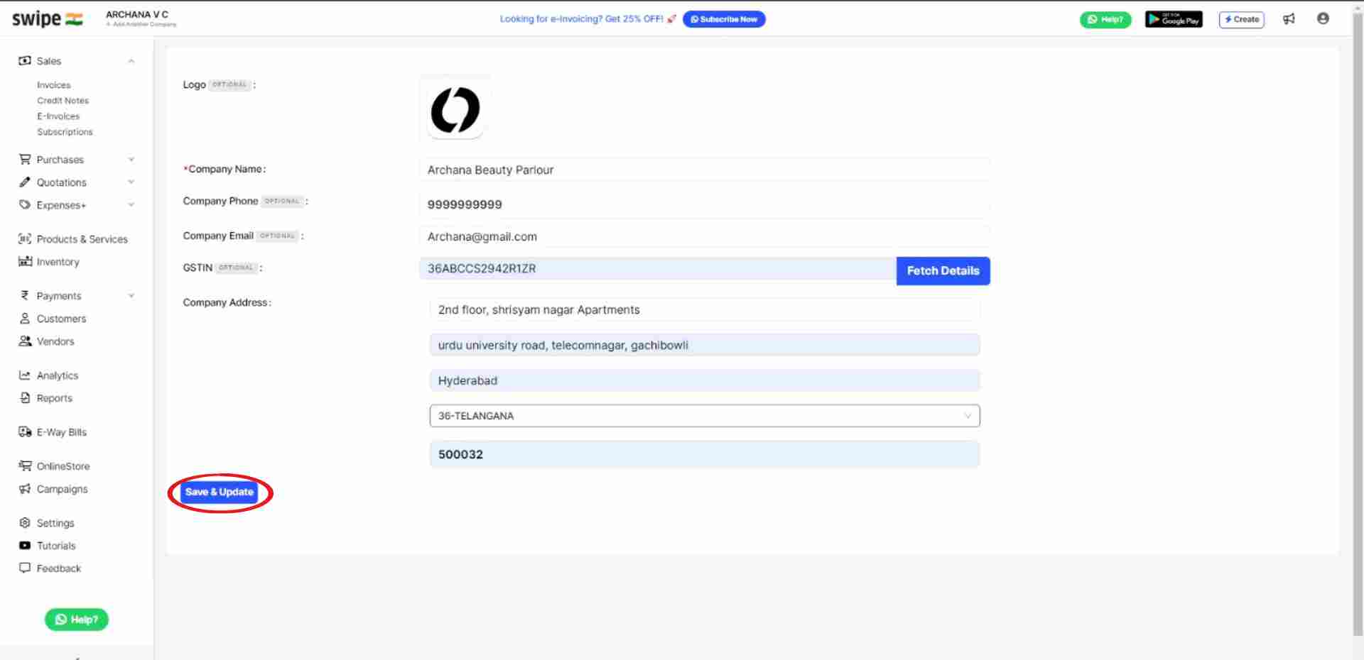 Now, fill in the other required details, like the GSTIN and address of the company.
