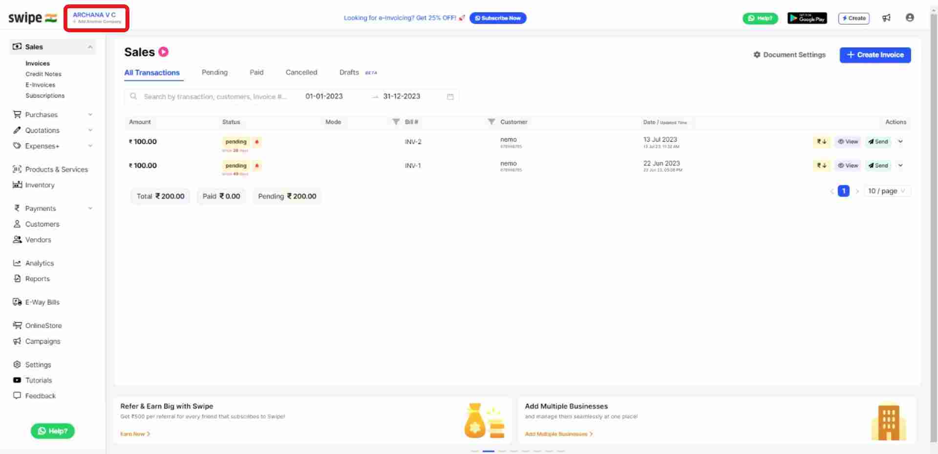 Your New / Second company details have been added successfully. Now, you will be taken to the dashboard of your new business.