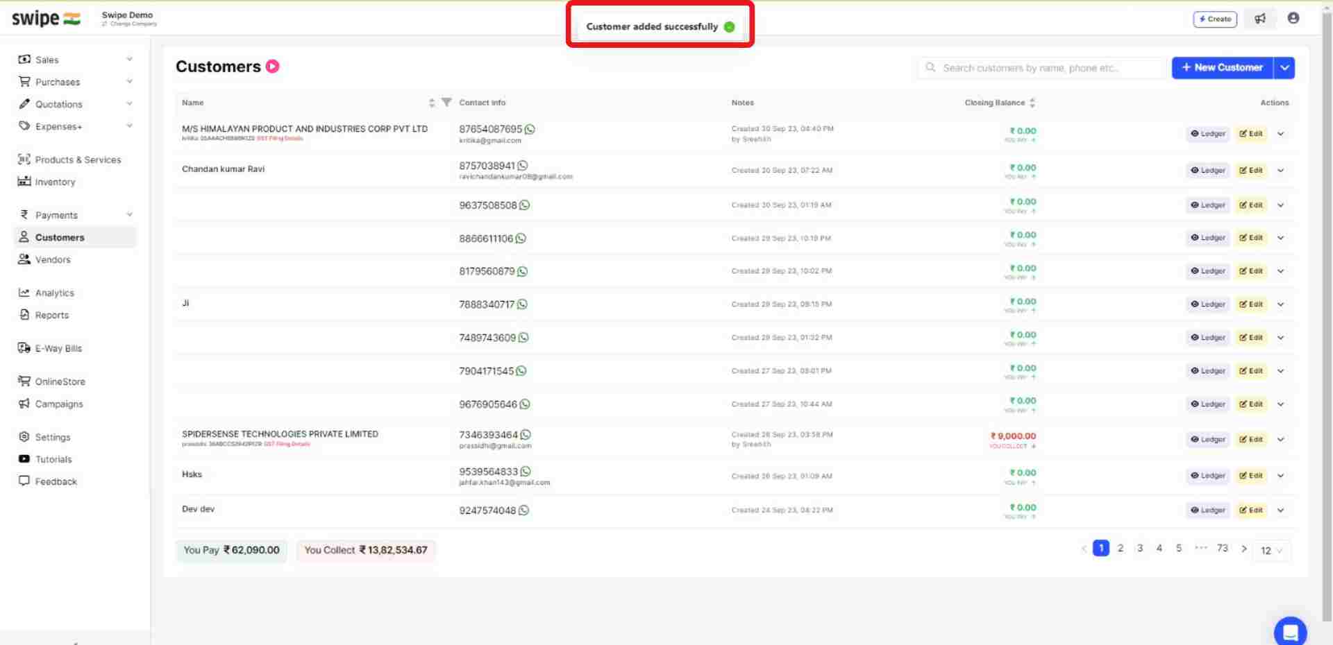 Note: You have successfully added a new customer and a pop-up will appear at the top of the screen informing the same.