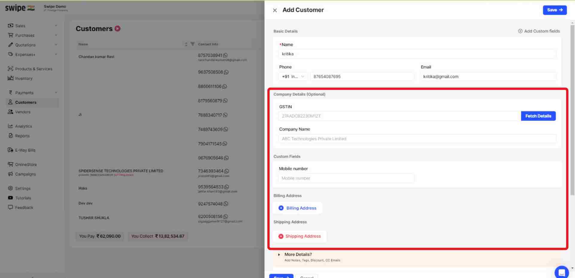 Fill in other required information about the customer, such as company name, GSTIN number billing address, etc.