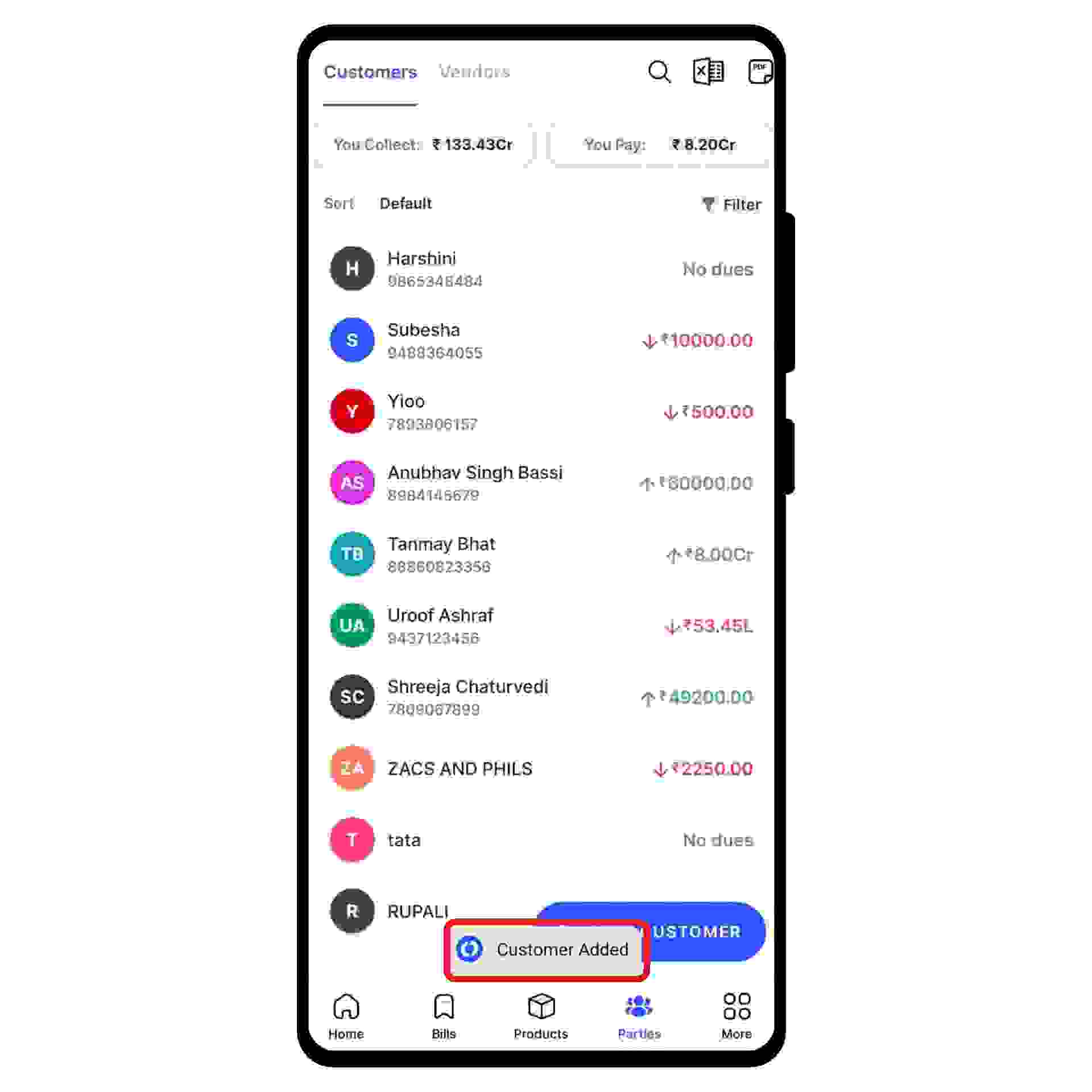 Note: You have successfully added a new customer and a pop-up will appear at the bottom of the screen informing the same.
