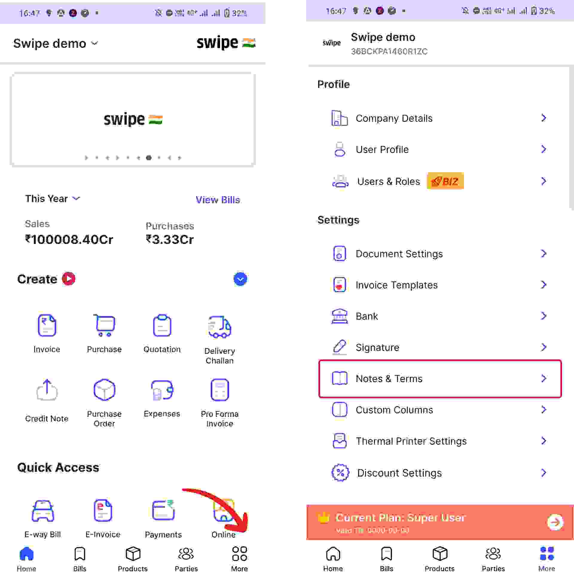Click on the “Settings” icon on the left dashboard and Select the “Notes and Terms” option from the menu.