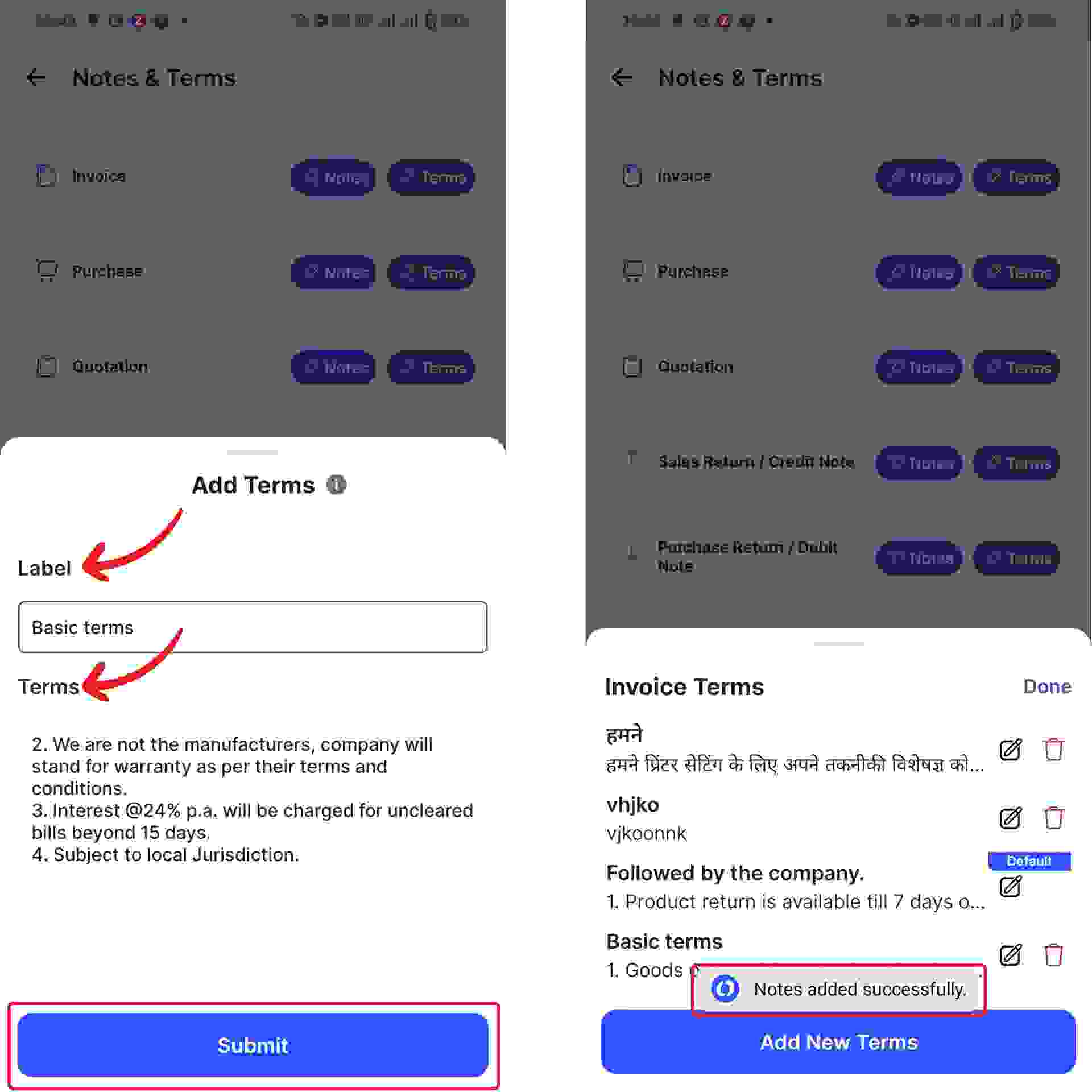 Congratulations! You have successfully added New Invoice terms, and a pop up appears at the bottom of the screen informing the same.
