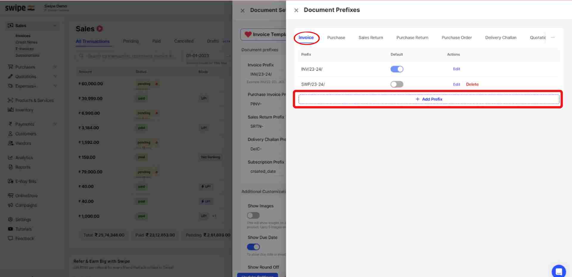 Select the “Invoice Prefix” option and click on “+Add New Prefix” from the drop down menu.