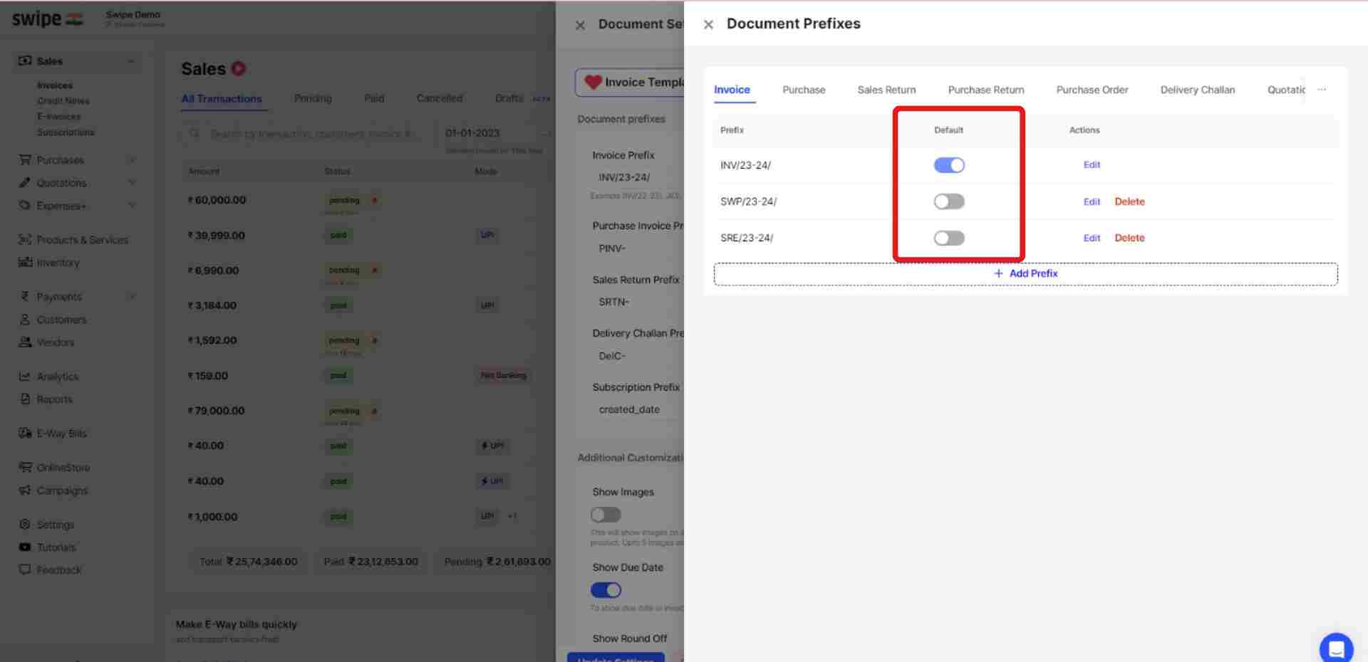 Select the Invoice prefix and switch on the toggle bar at the respective column to make it default.