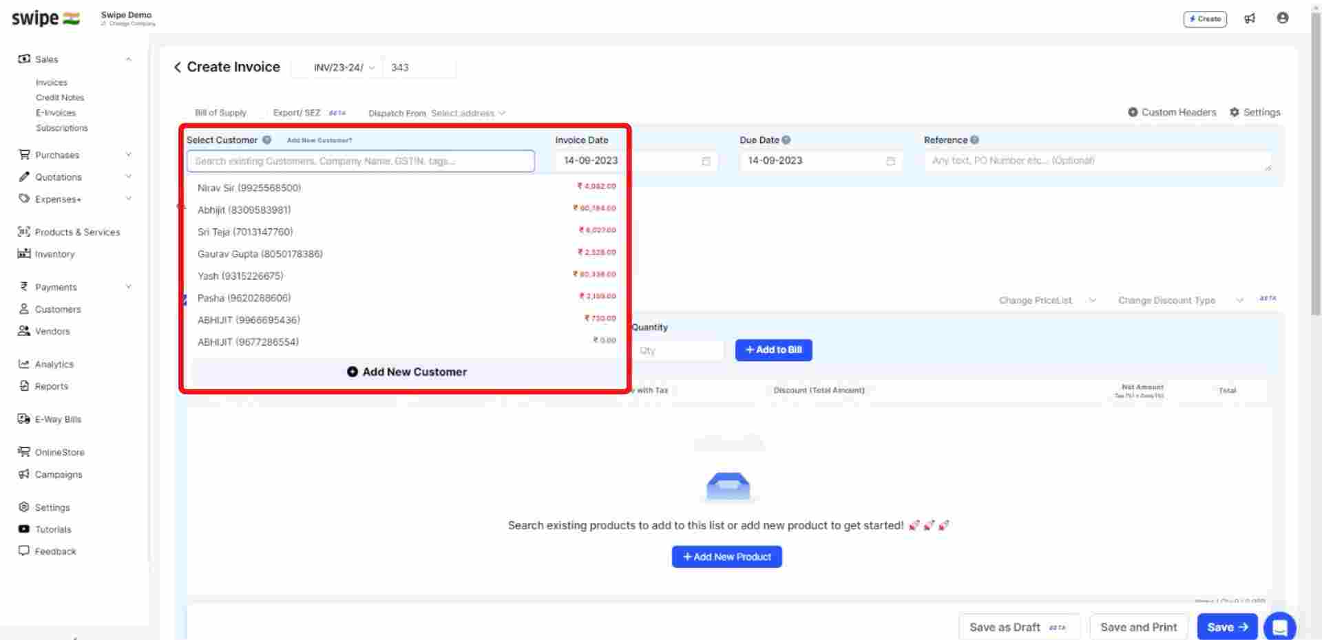 You can select existing customers from the drop-down list or add new customers by typing in their details manually.