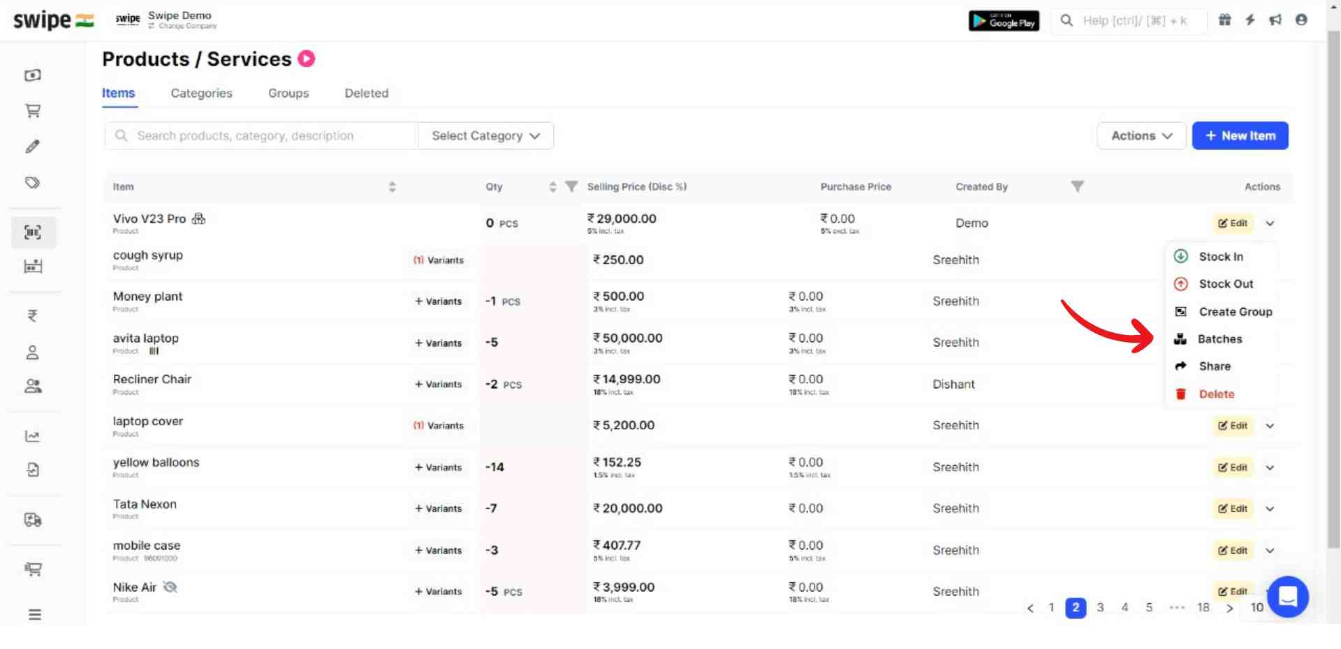 Now, click on the drop-down menu present at the end of the invoice column and select “batches” from the drop-down menu.