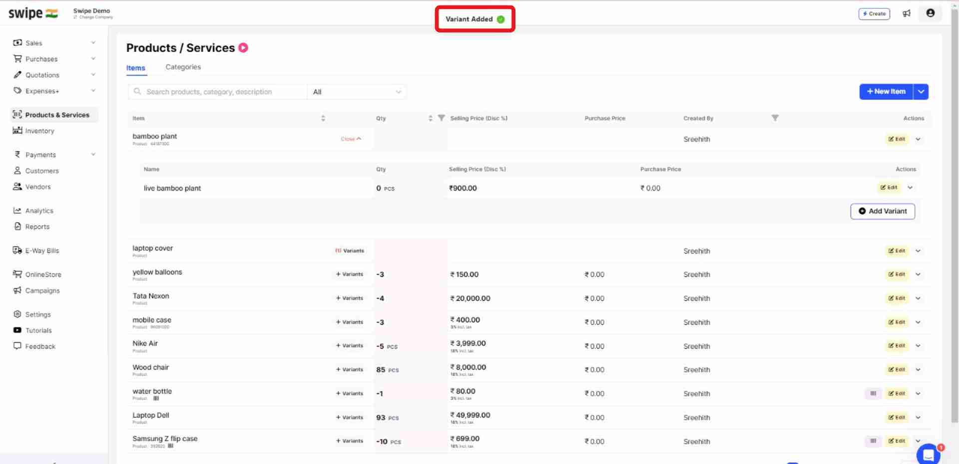 Congratulations! You have successfully added a new product variant. A pop-up will appear at the top of the screen informing the same.