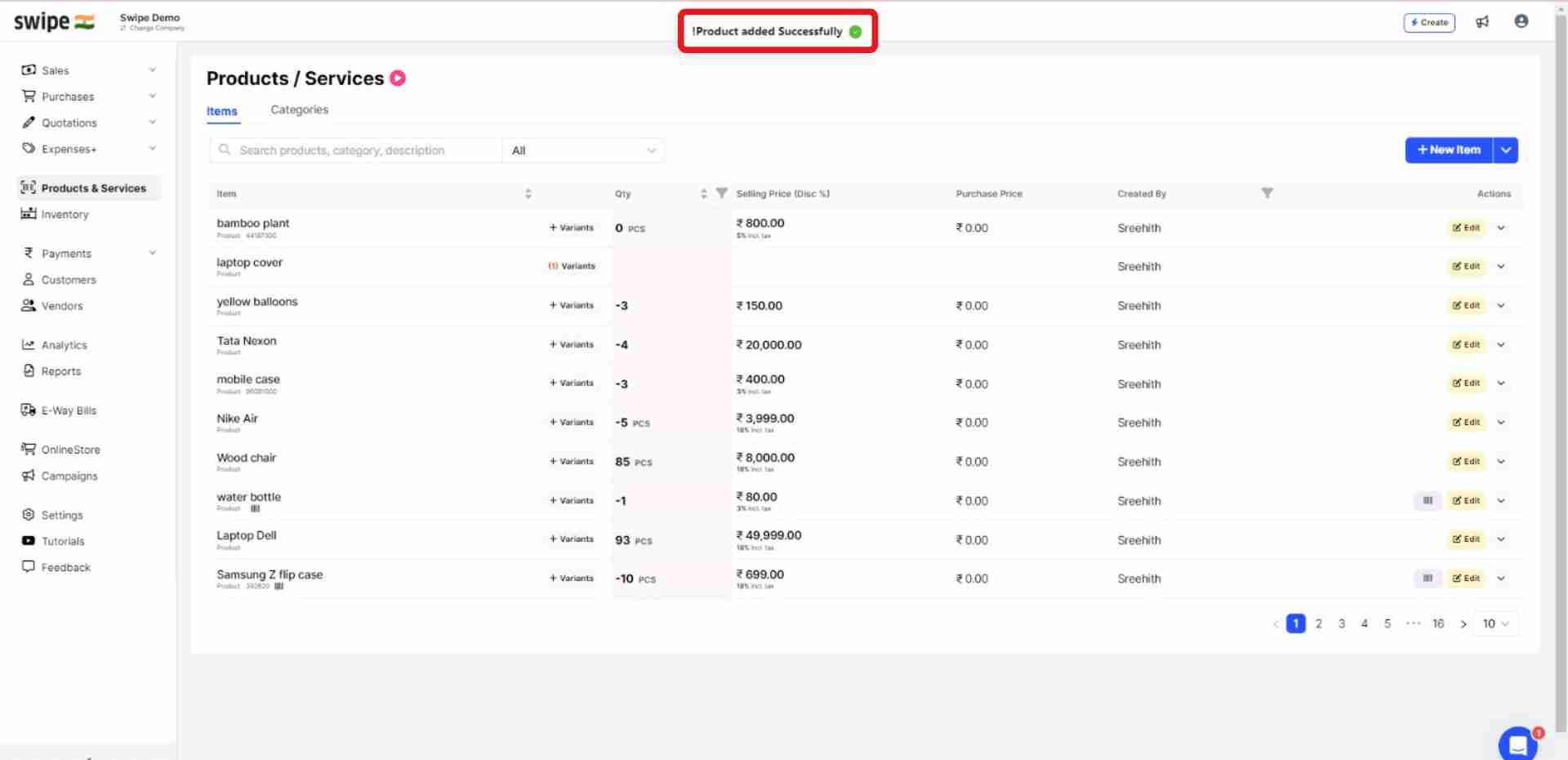 Congratulations! You have successfully added a new product to your product list and a pop-up appears at the bottom of the screen informing the same.