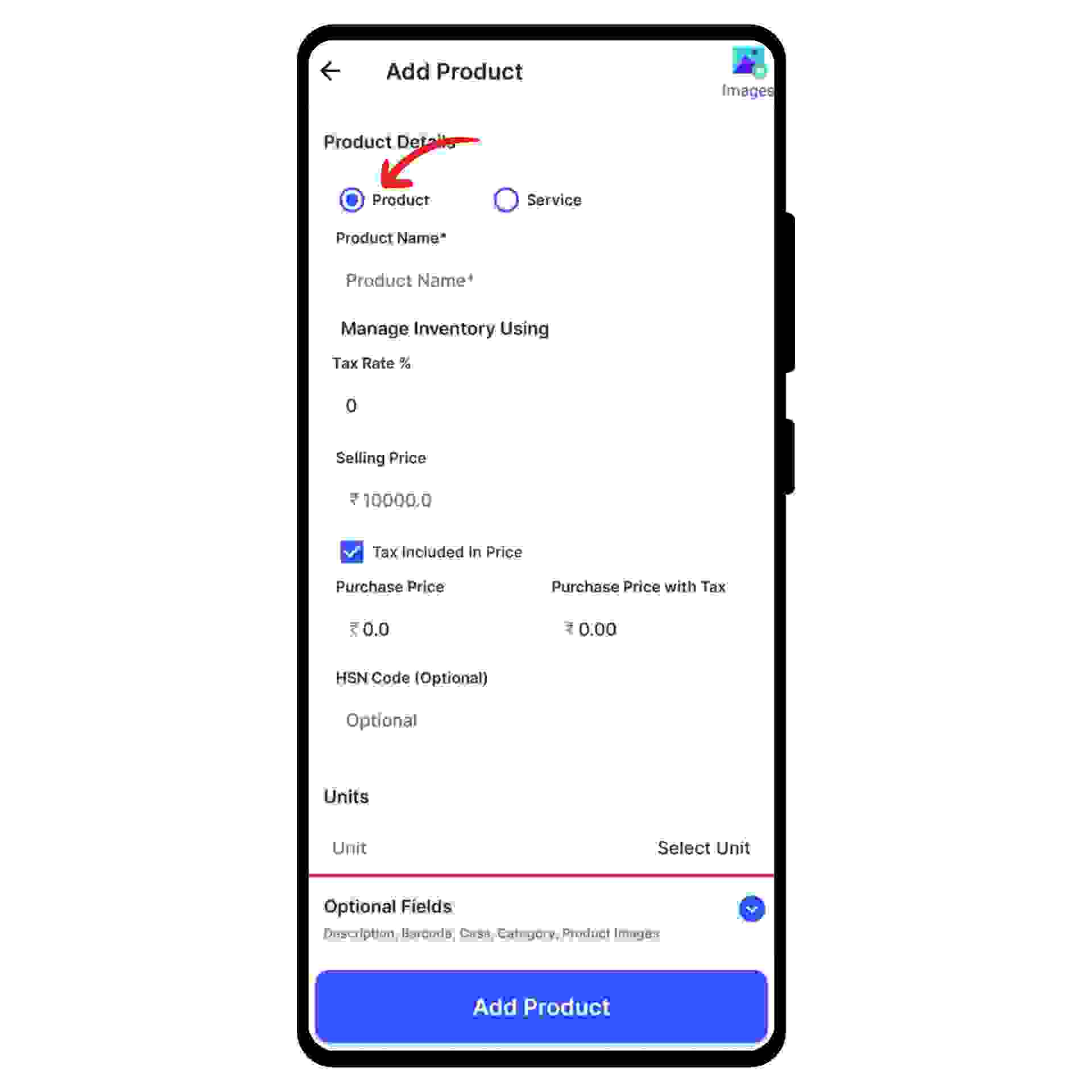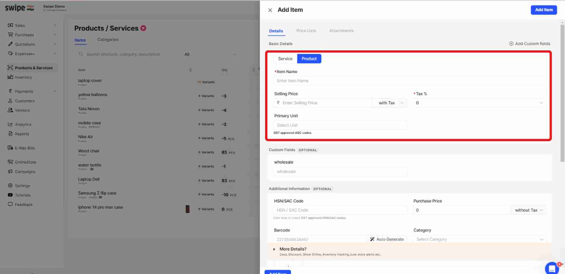 Select the type as either product or service and fill in the basic details like product name, selling price, and tax percentage.