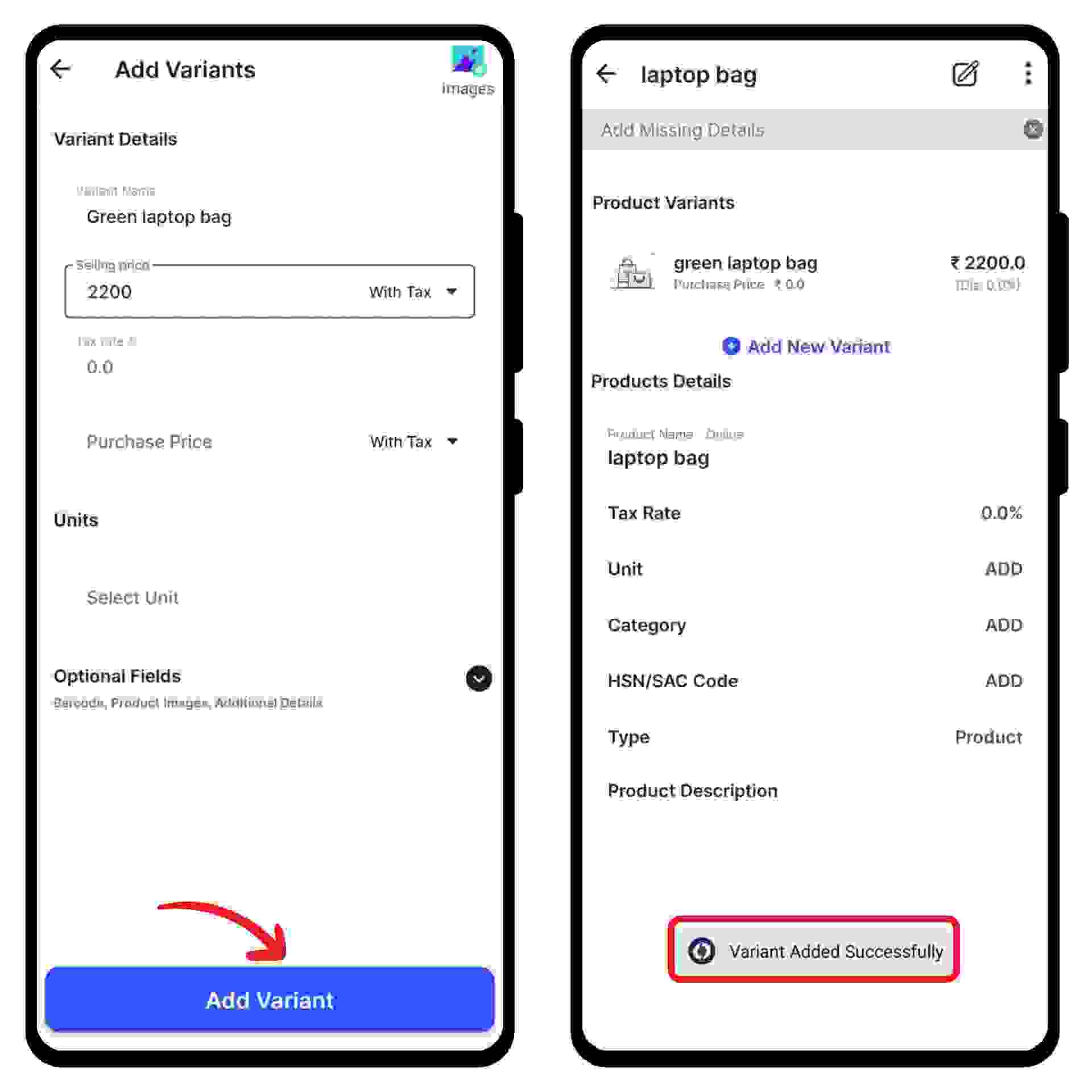 Now, fill in the basic details like variant name, selling price, and tax percentage.
