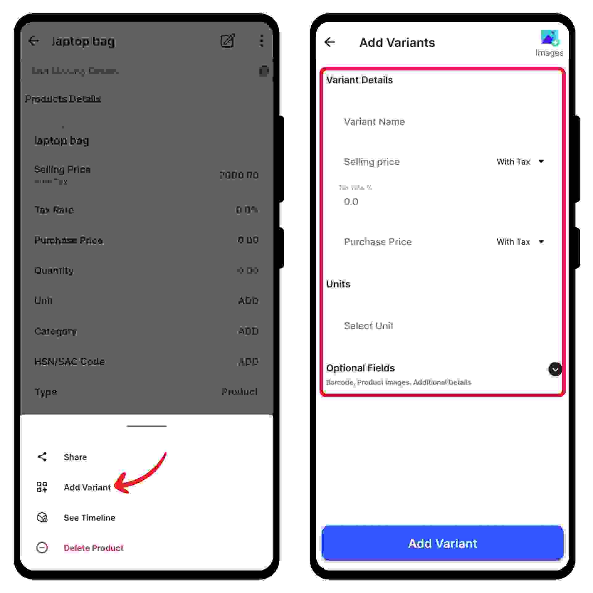 A new form appears. Here, fill in the basic details like variant name, selling price, and tax percentage.