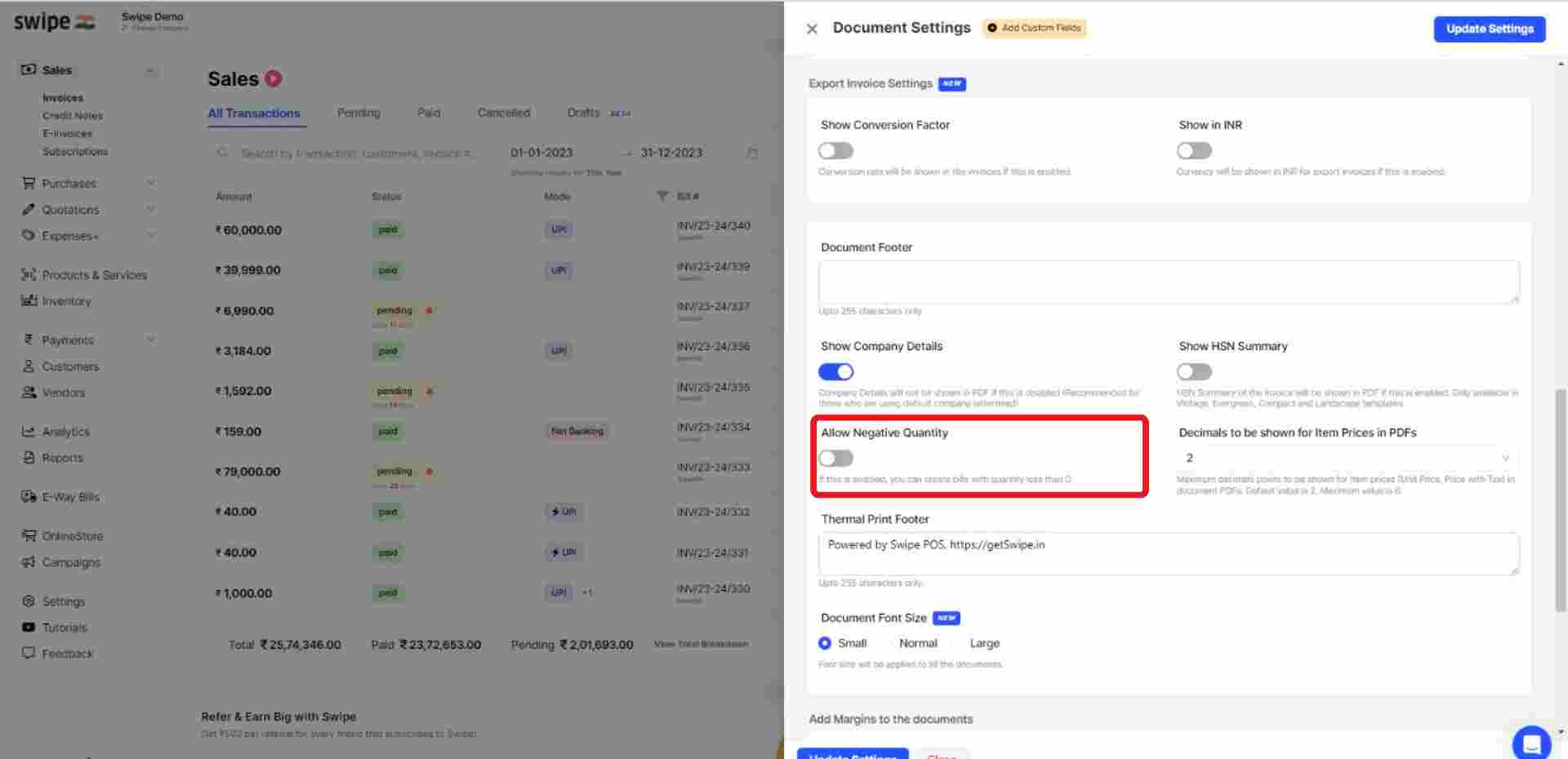 Go to the “Allow Negative Quantity” column under the “Additional Customizations” section and switch on the toggle bar.