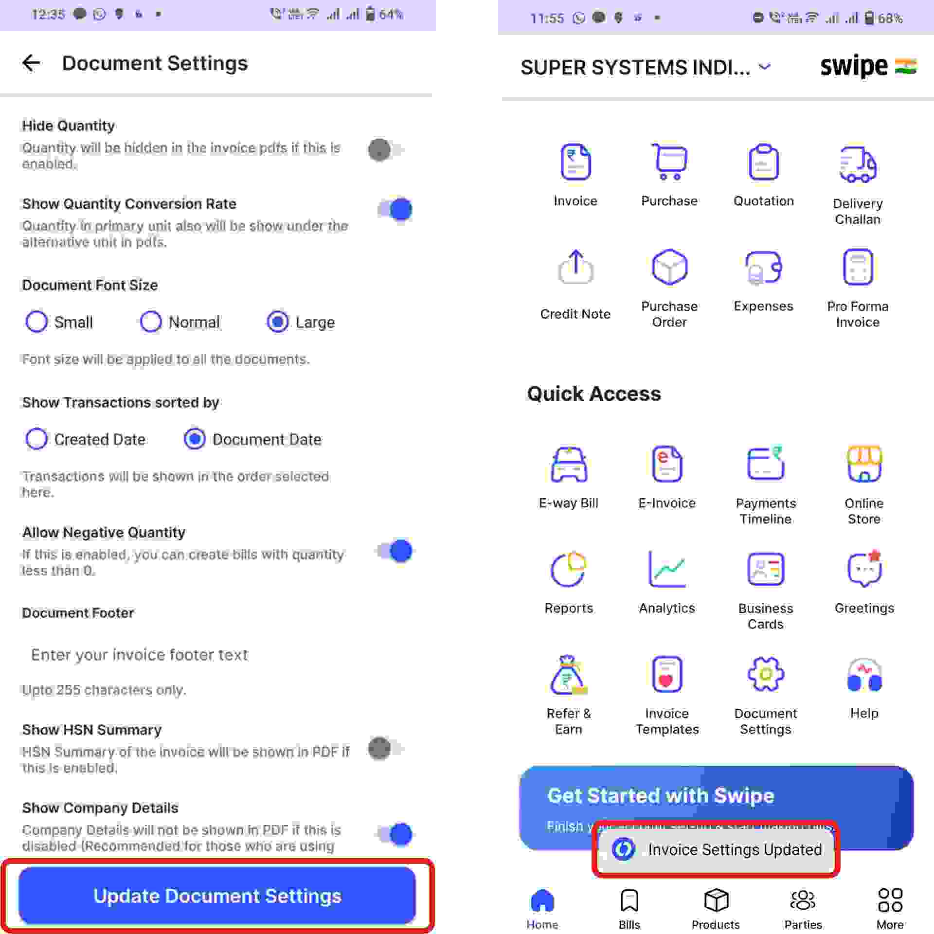 Congratulations! You have successfully updated document settings, and a pop up appears at the bottom of the screen informing the same.