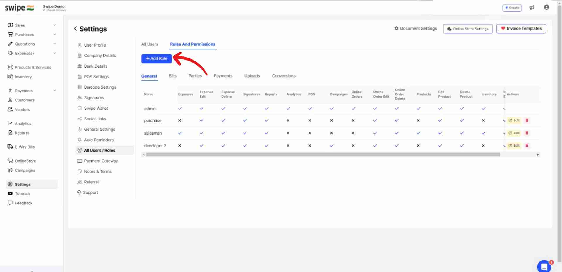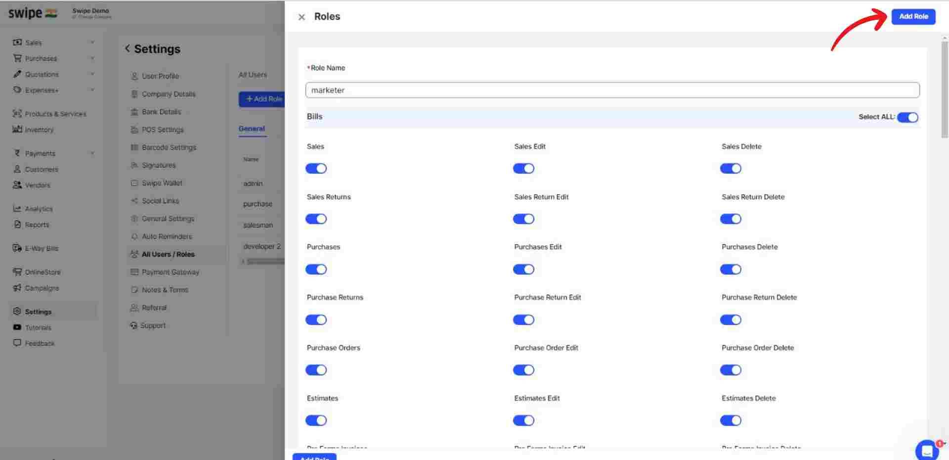 A new form appears. Now, enter the role name and switch on the toggle bar beside the permissions you would like to give access to for the specific role.