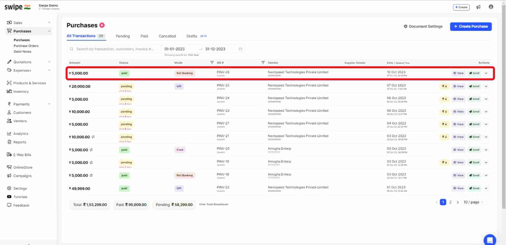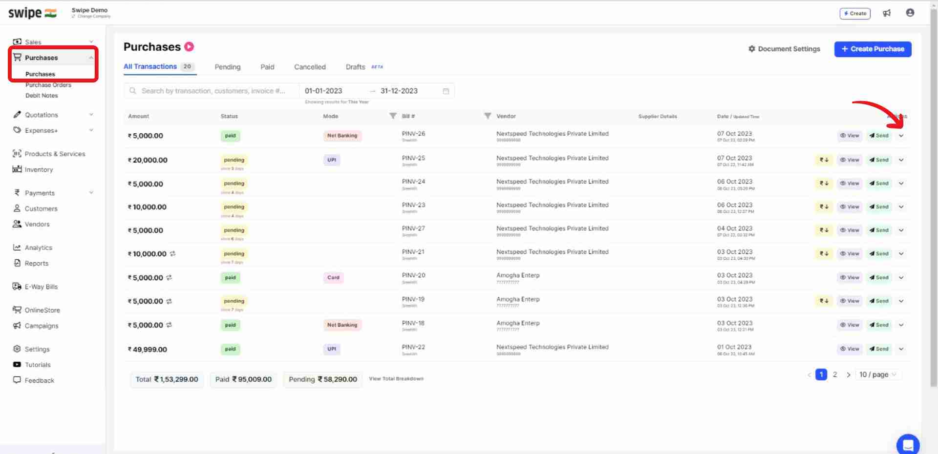 Select or search for the purchase invoice you want to edit and click on the drop-down menu at the end of the invoice column.
