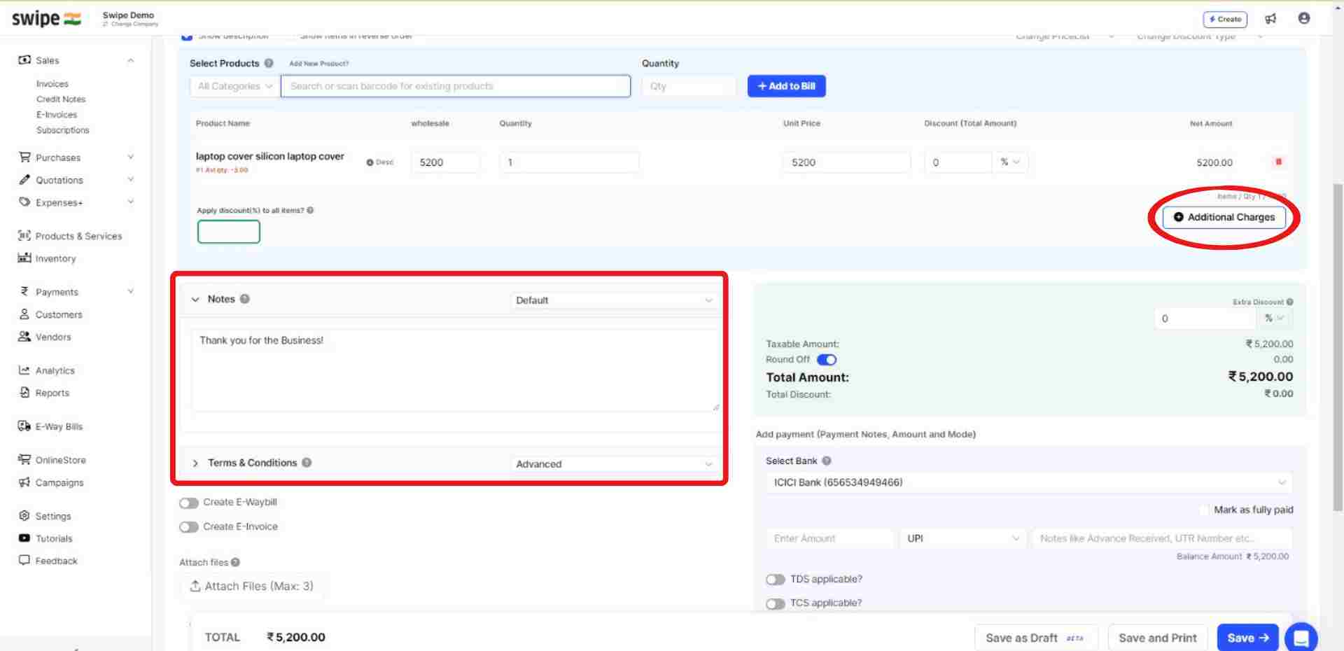 Also, add additional charges (if applicable) and create or edit notes, as well as terms and conditions.