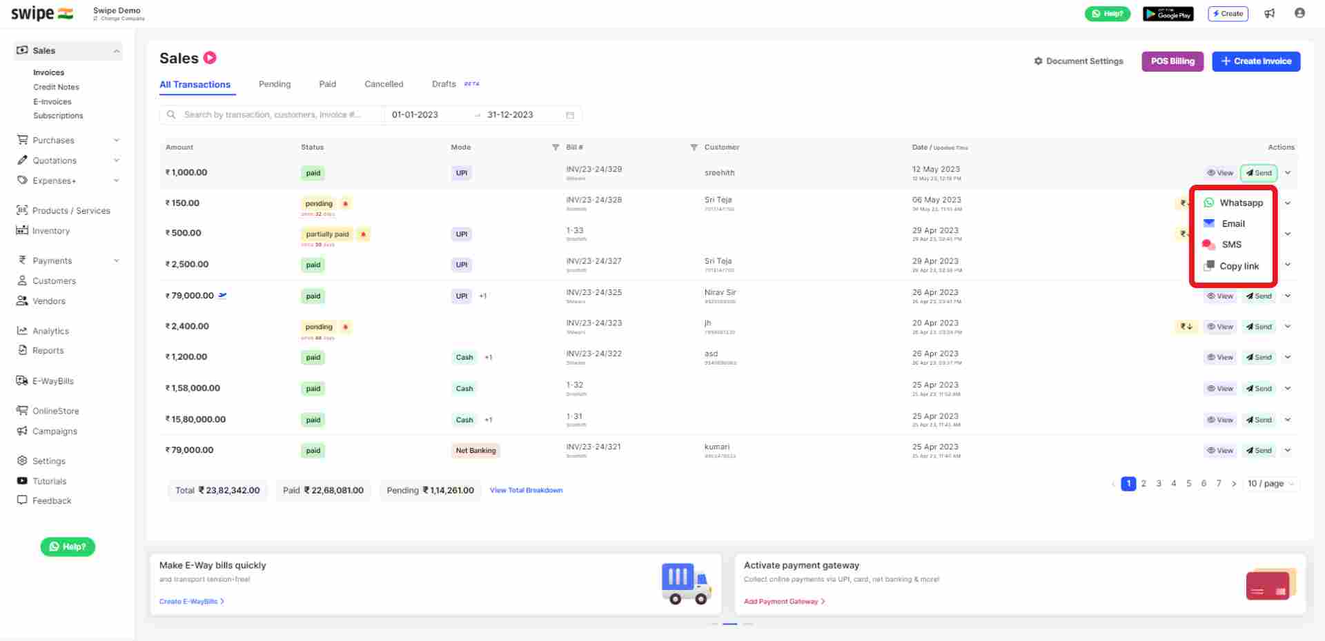 Your Subscription/recurring invoice will be ready and you can share it via WhatsApp, SMS or Email it to your customer from the sales invoice dashboard.
