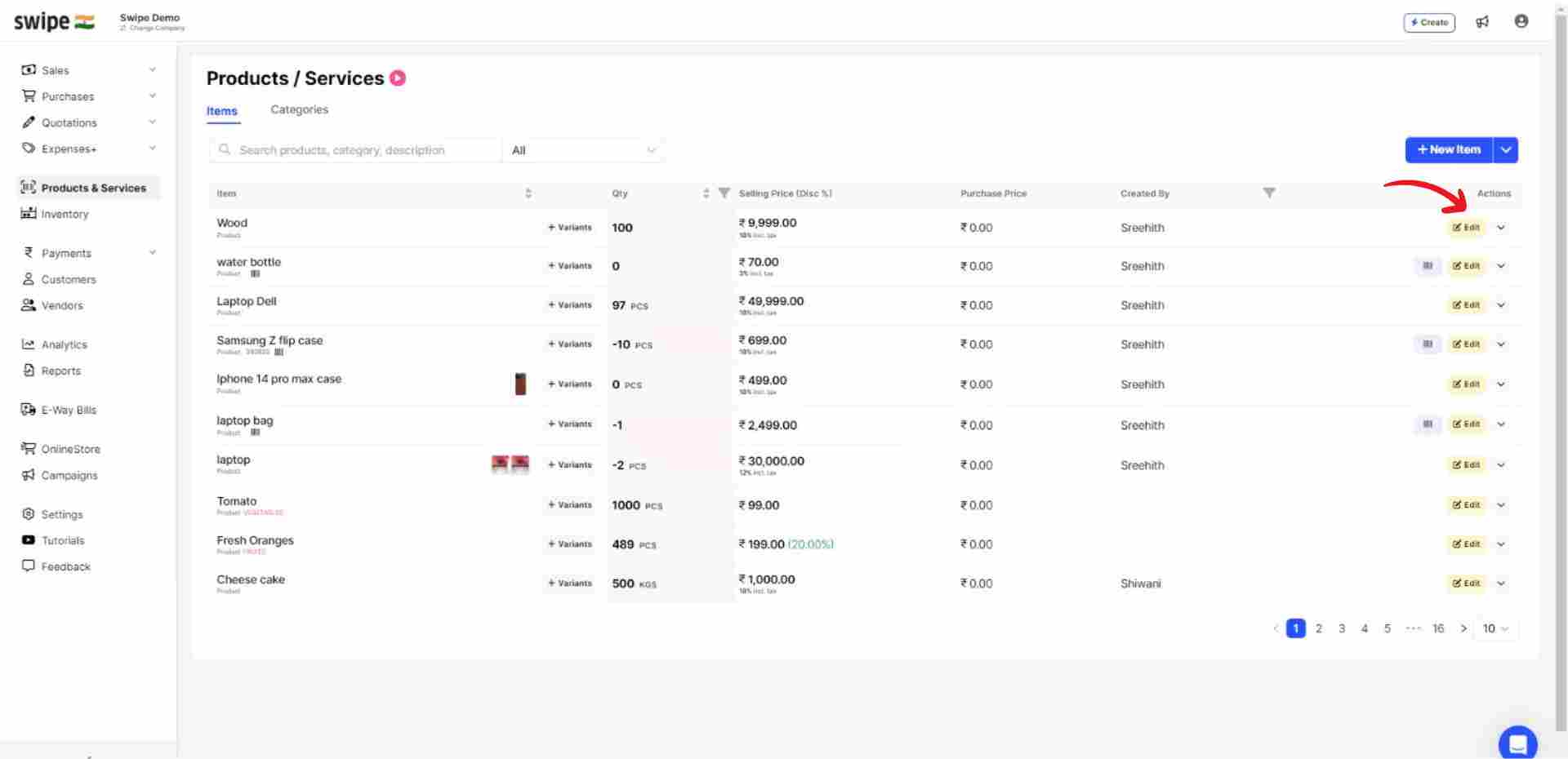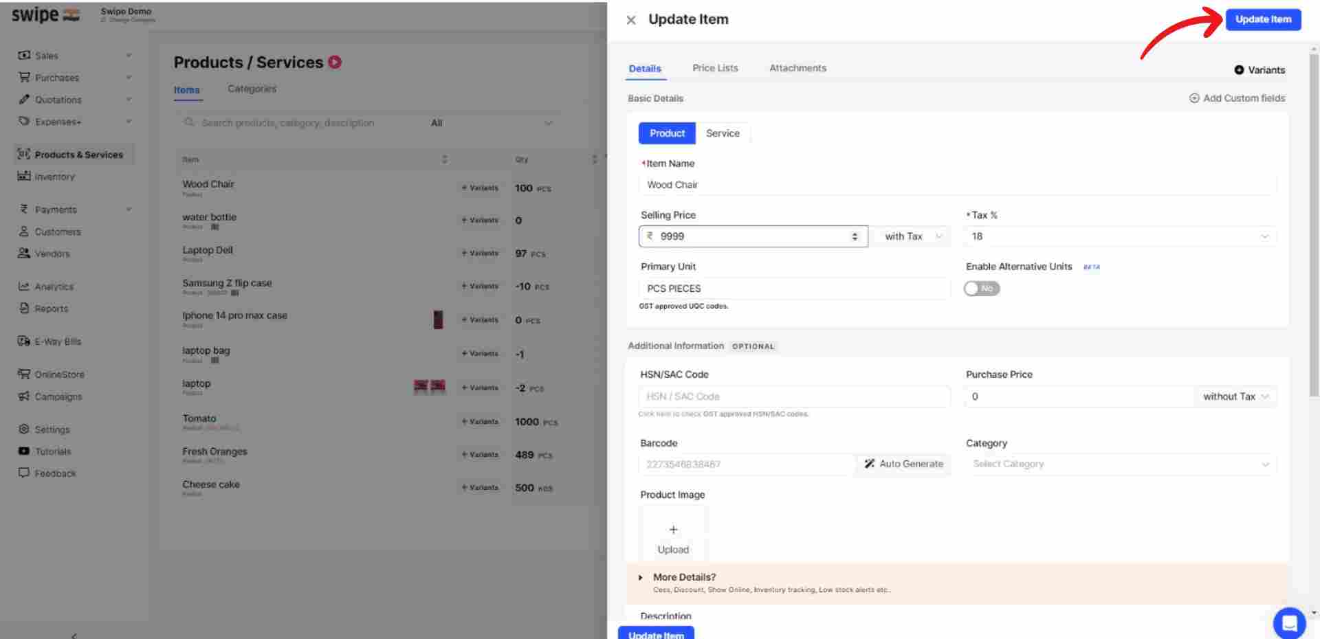 You can change basic details like Name, selling price, and tax percentage and also edit details like units of measurement and custom fields like serial numbers, department, etc.