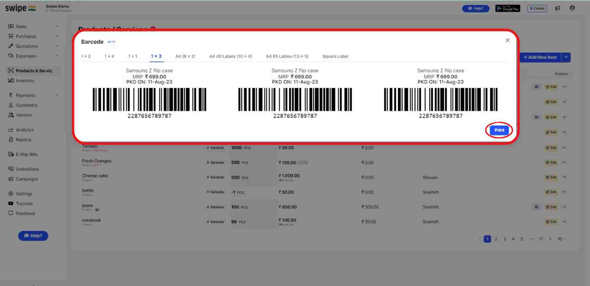 Once added, click on the barcode icon at the end of the product column to view the barcode. Select the required quantity and click on the print option to print the barcode.