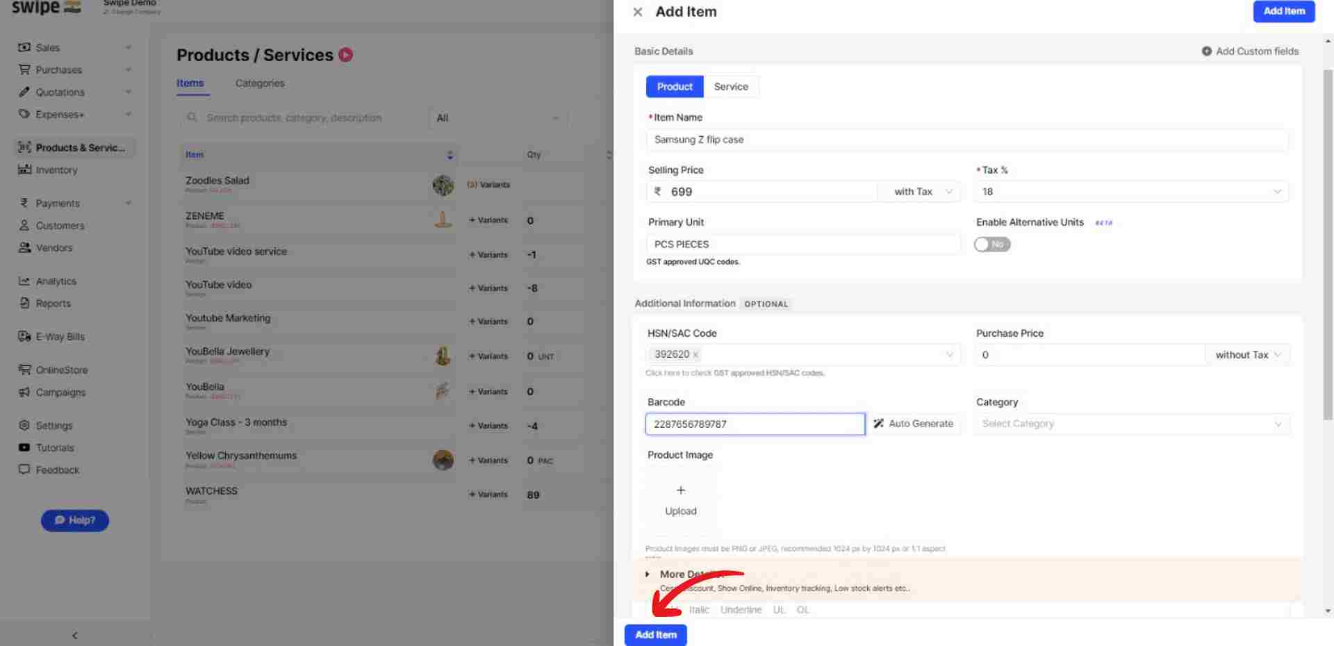 (You can also add units of measurement, HSN / SAC Code, purchase prices, category, etc.)