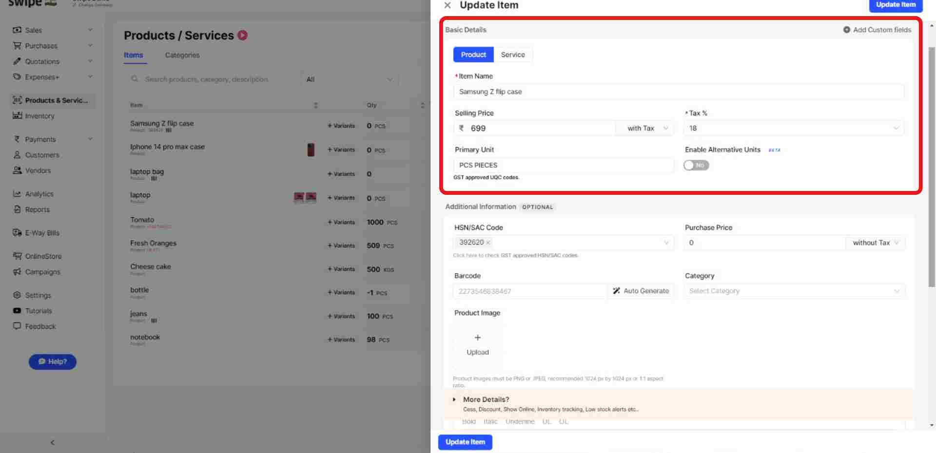 Fill in other required information about the product, such as HSN / SAC Code, purchase price, category, etc.