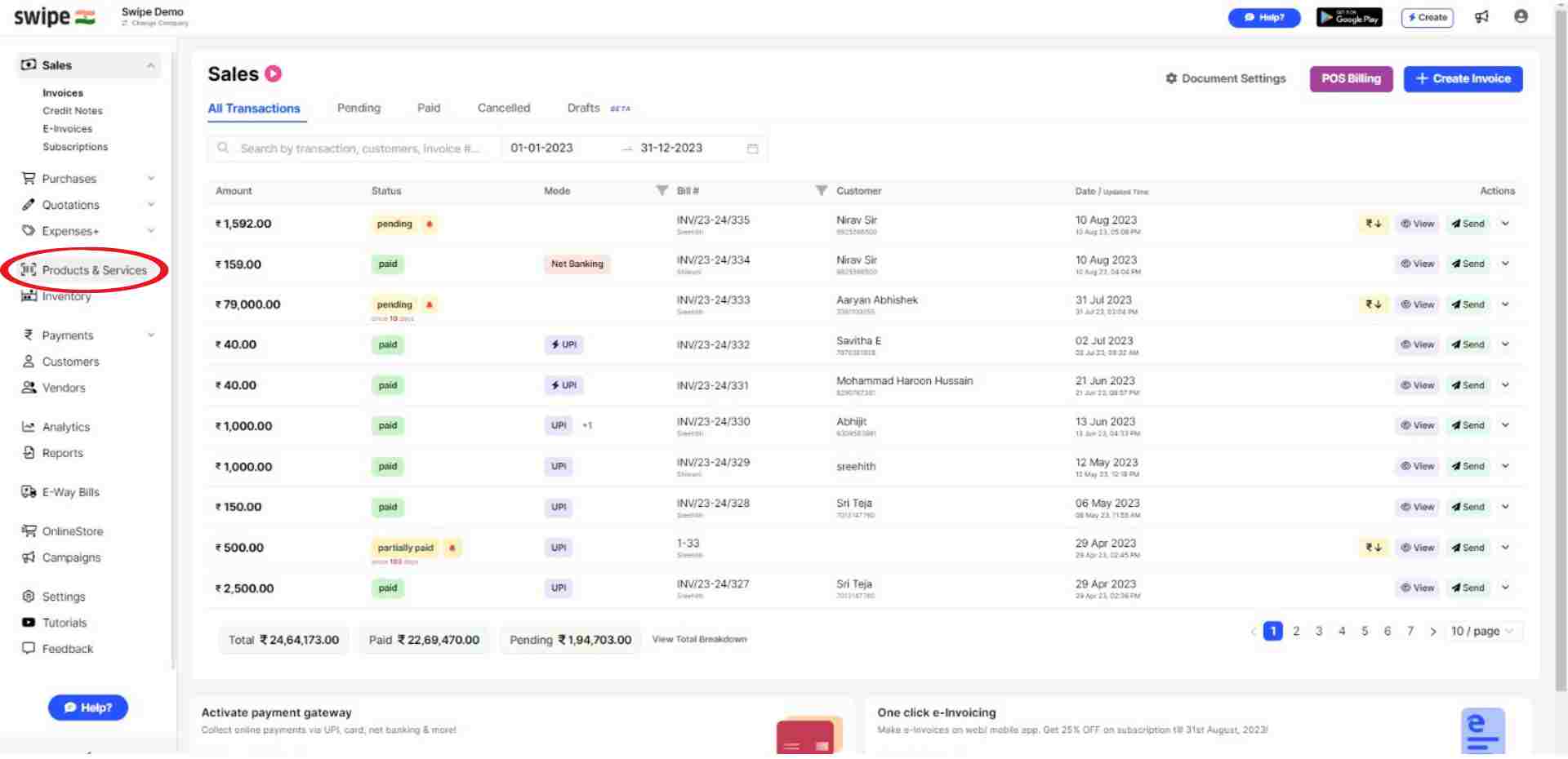 Select the Type as either product or service and fill in the basic details like product Name, selling price, and tax percentage.