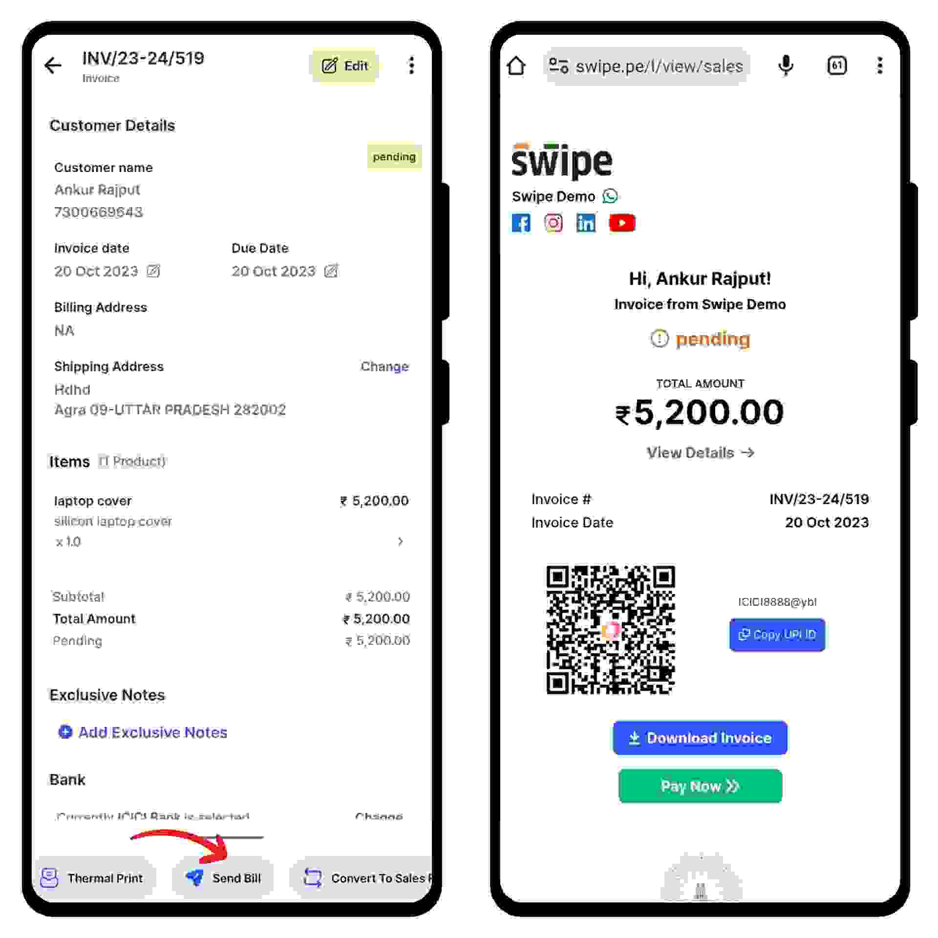Now click on the “Send Bill” icon present at the bottom of the screen and select the WhatsApp option from the pop-up.