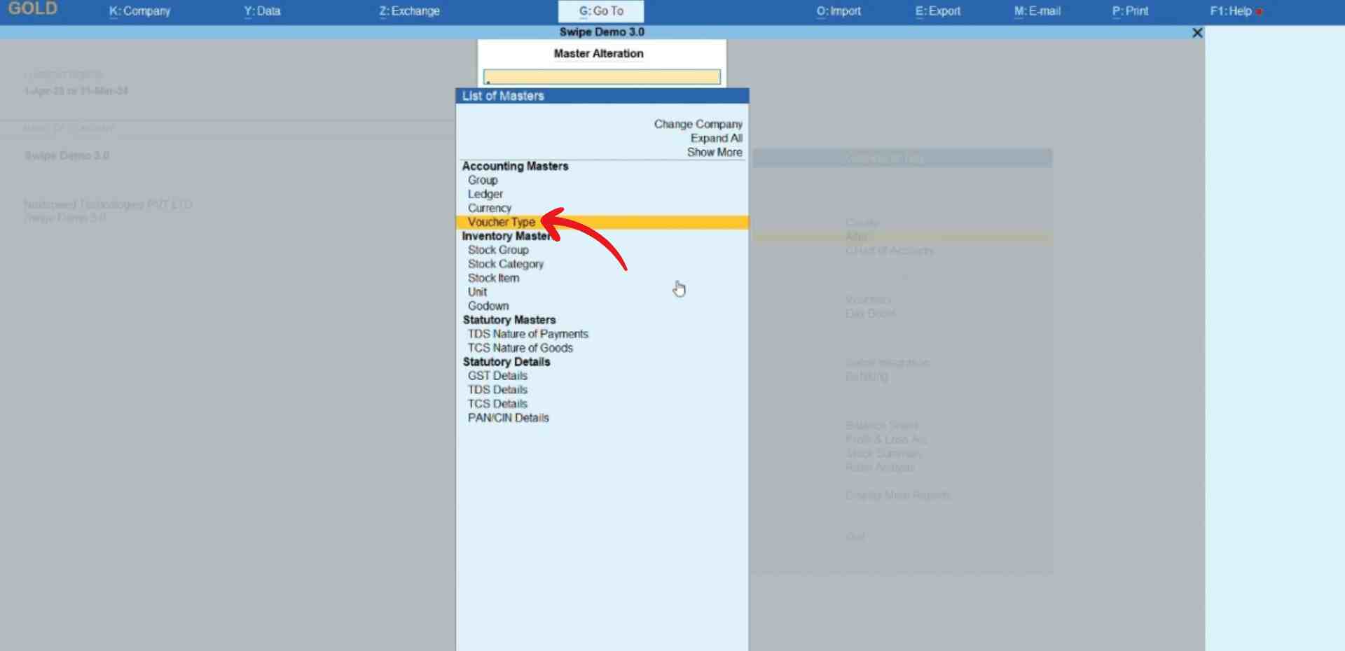 A new page appears. Here, click on “Voucher Type” under the Accounting Masters section.