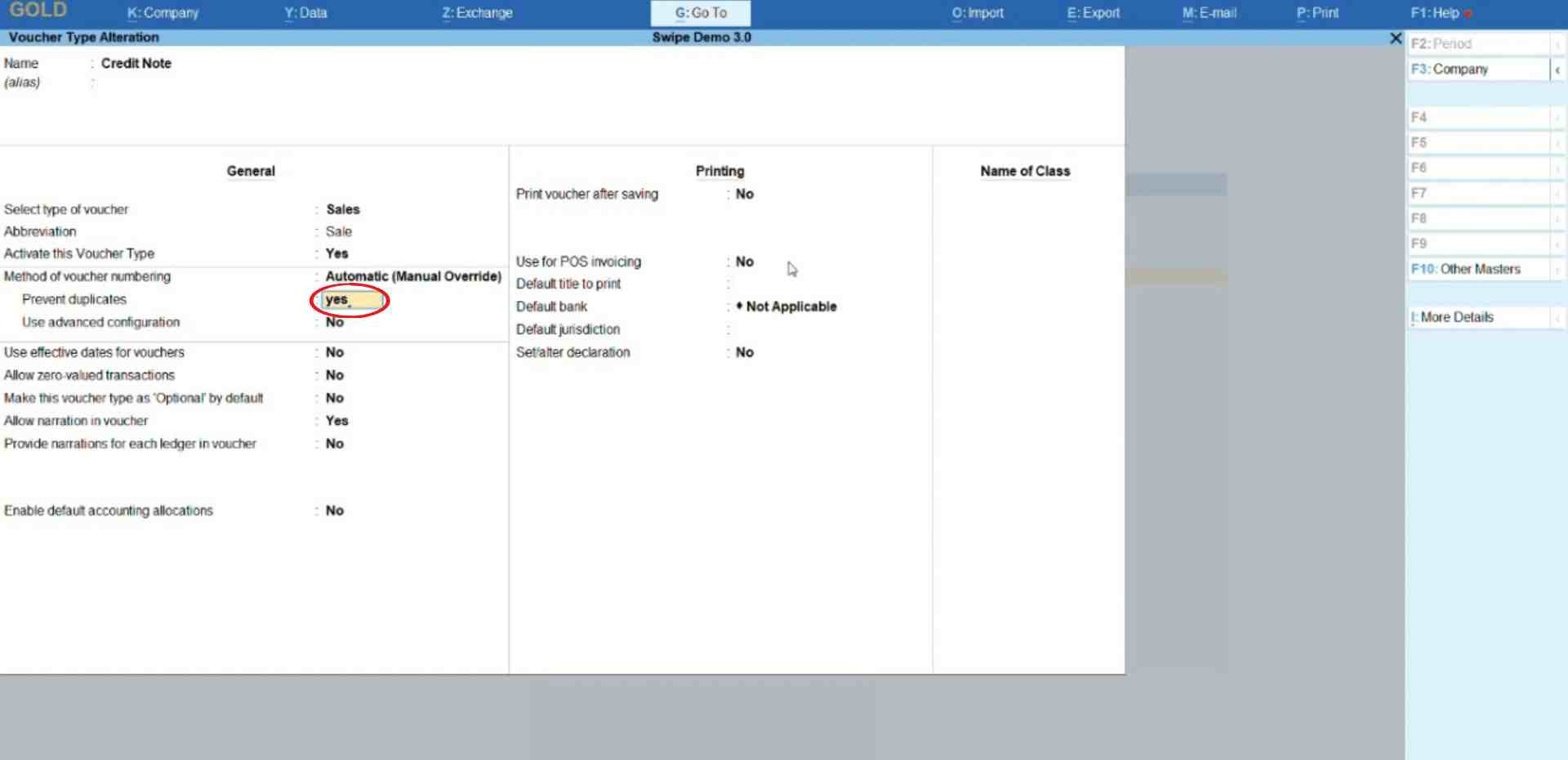 Change “Method of Voucher Numbering” to Automatic (Manual Override)