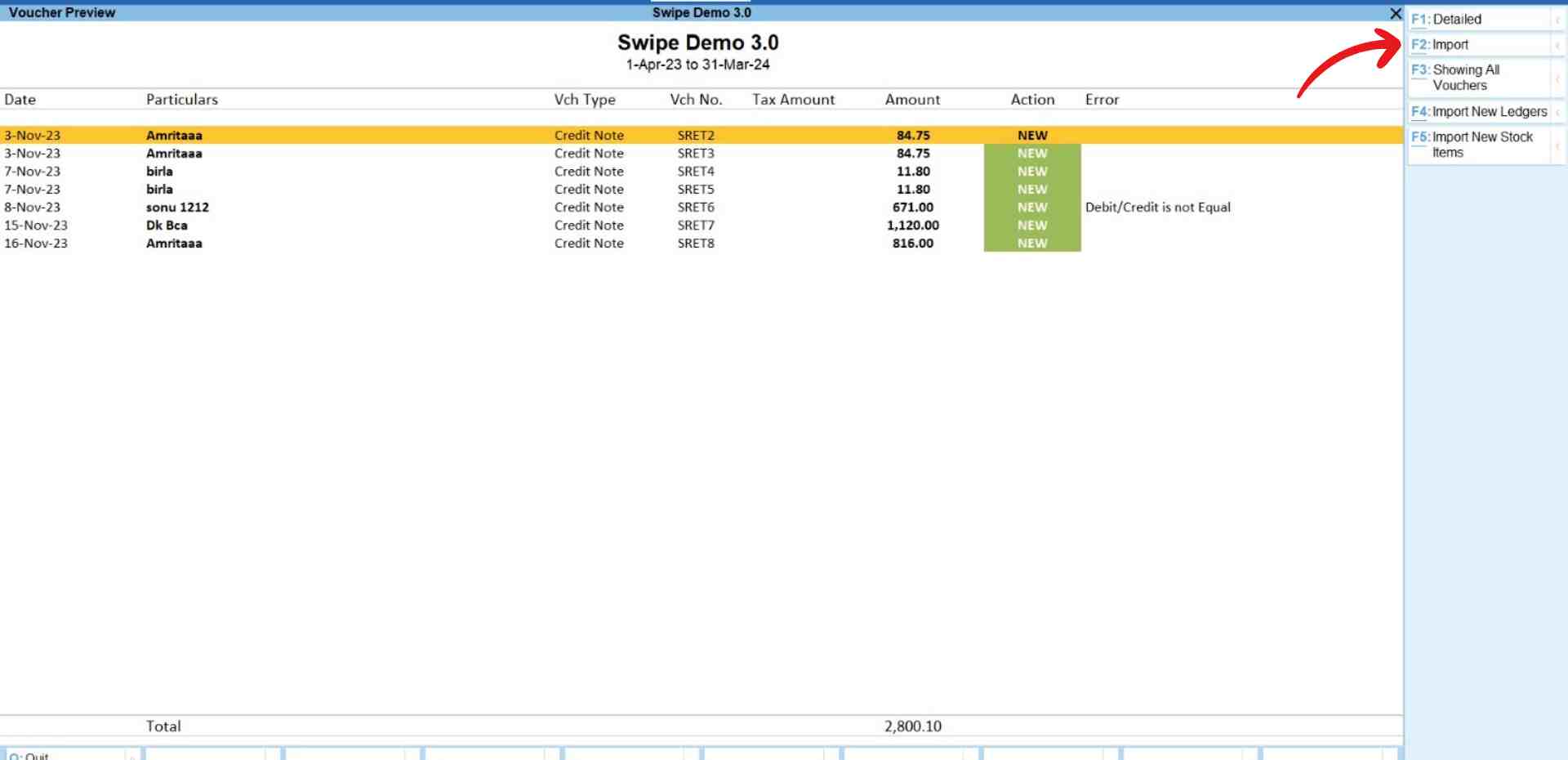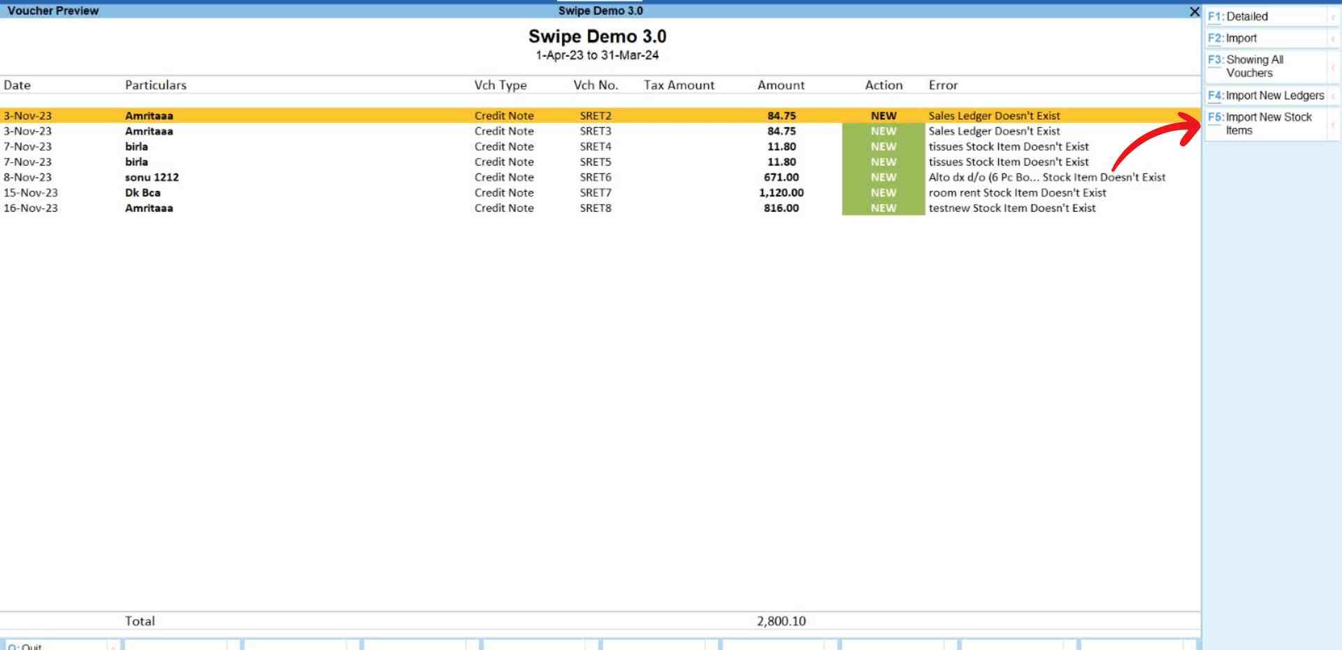 For the error “Ledgers Doesn’t Exist”: Click on the “Import New Ledgers” option present at the top right corner of the screen or press the F4 key on your keyboard.