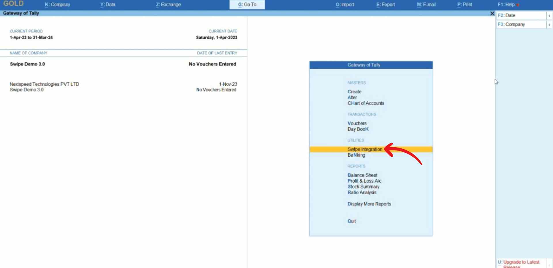 Go to "Swipe Integration" which is under the Utilities section of “Gateway of Tally”.