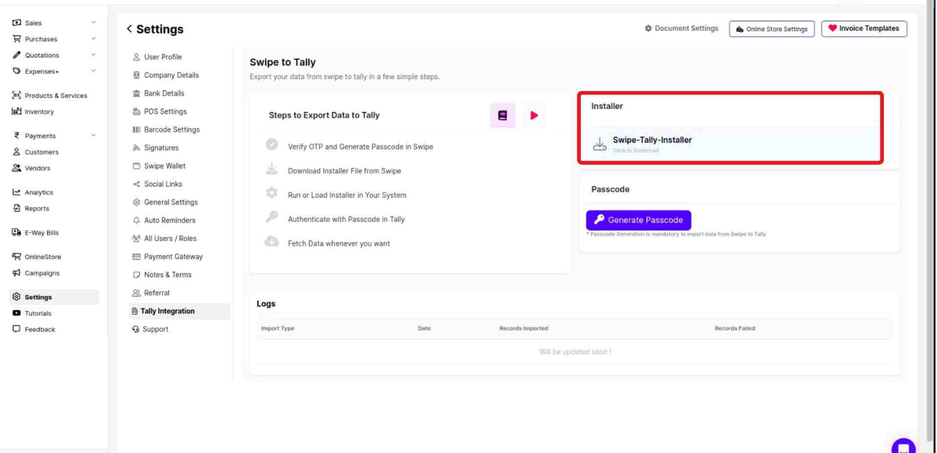 Click on the “Settings” icon on the left dashboard and select the “Tally integration” option from the menu.