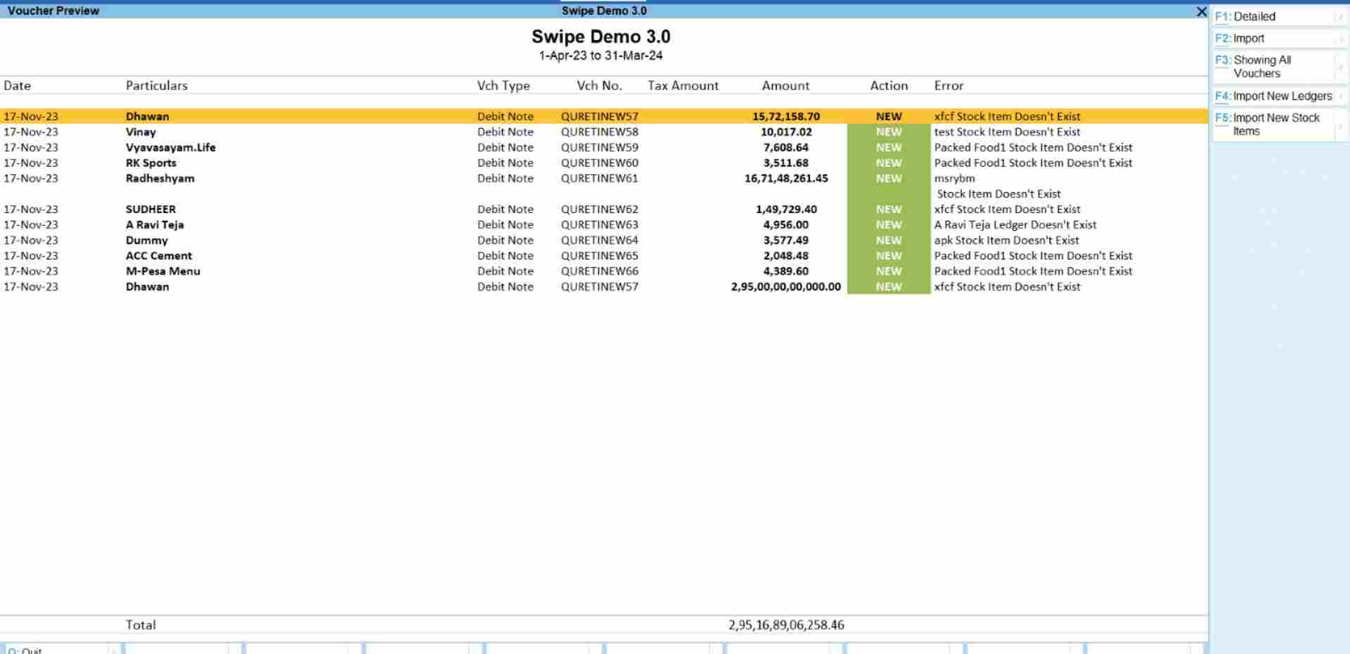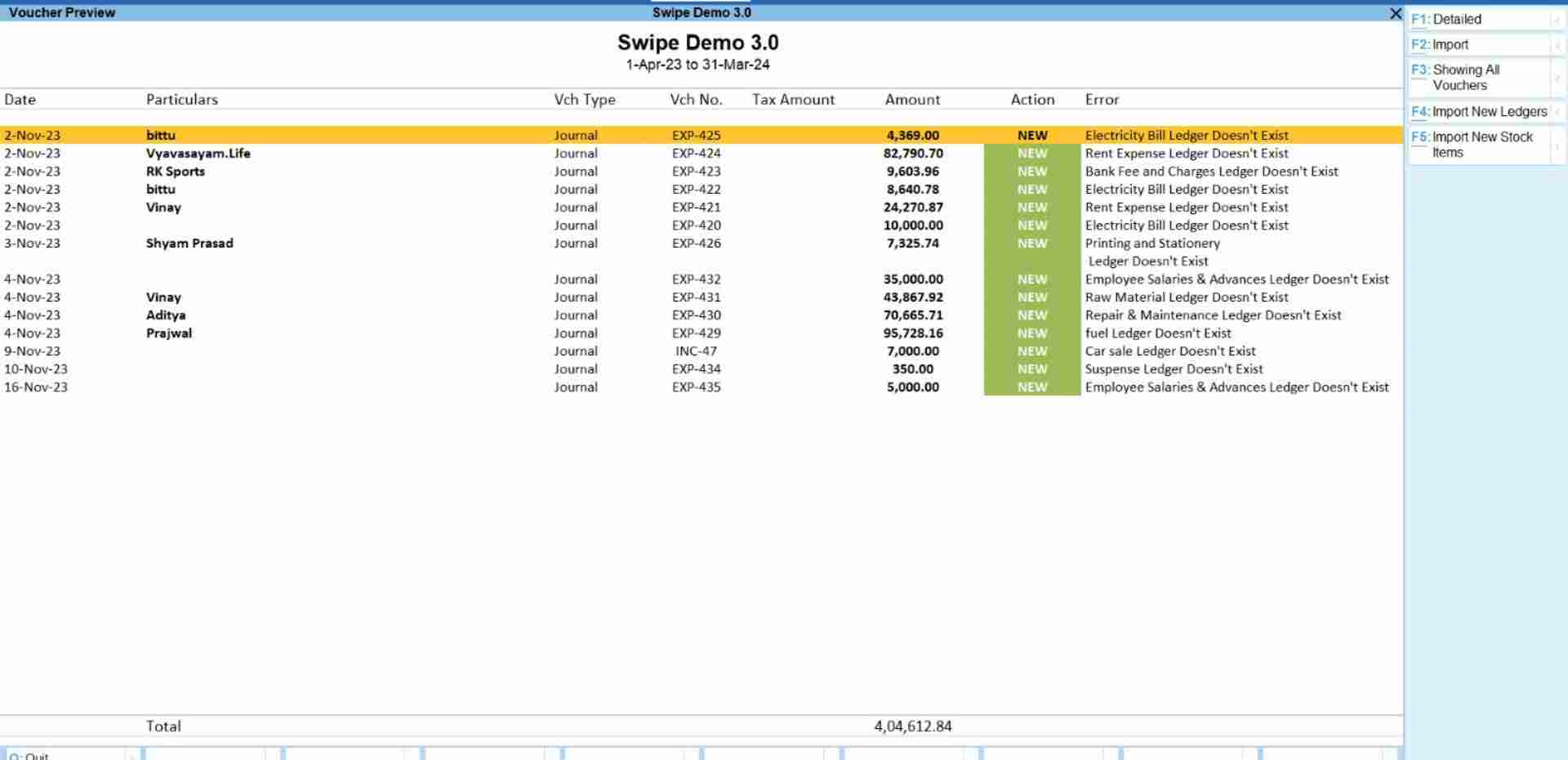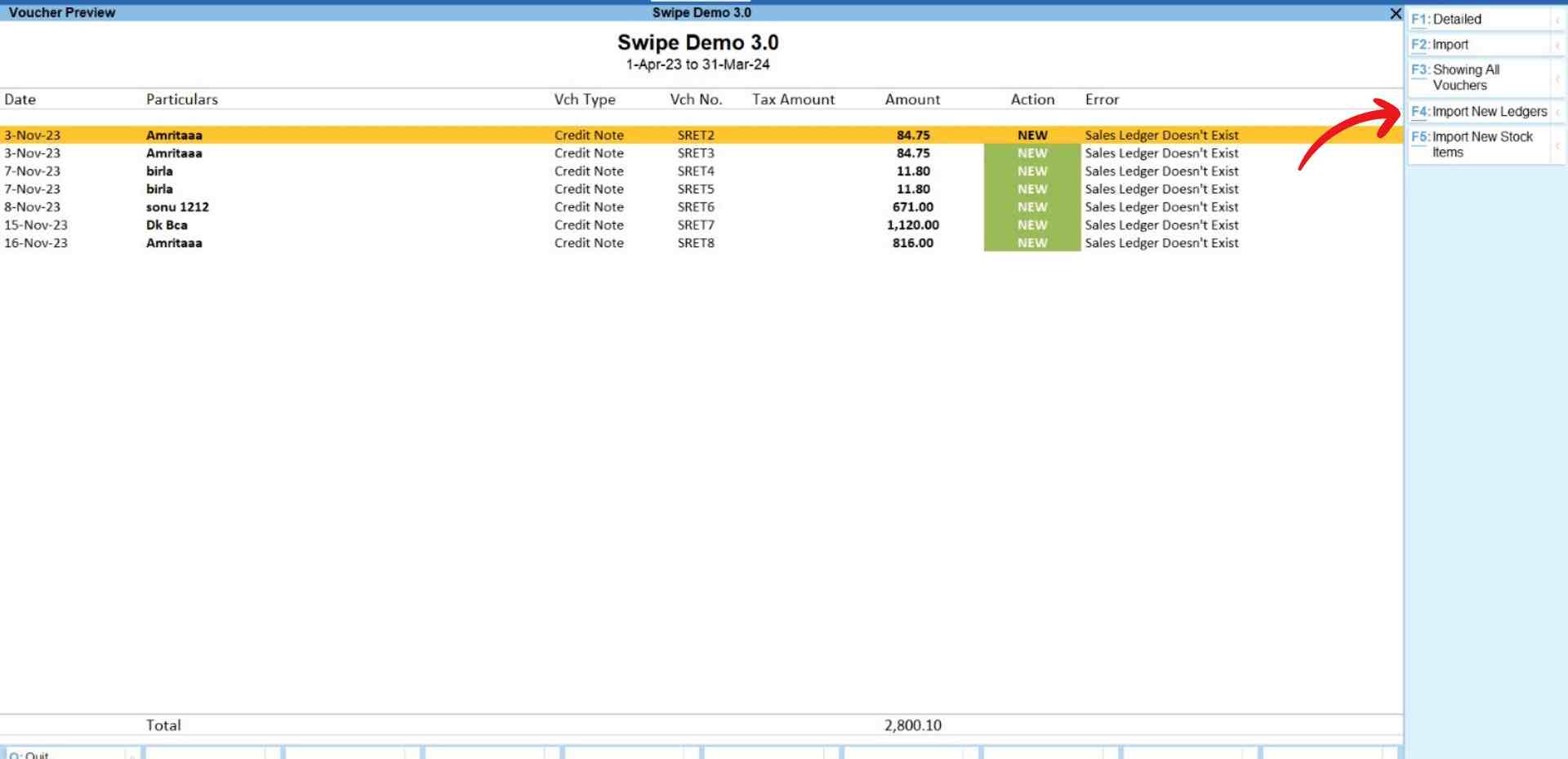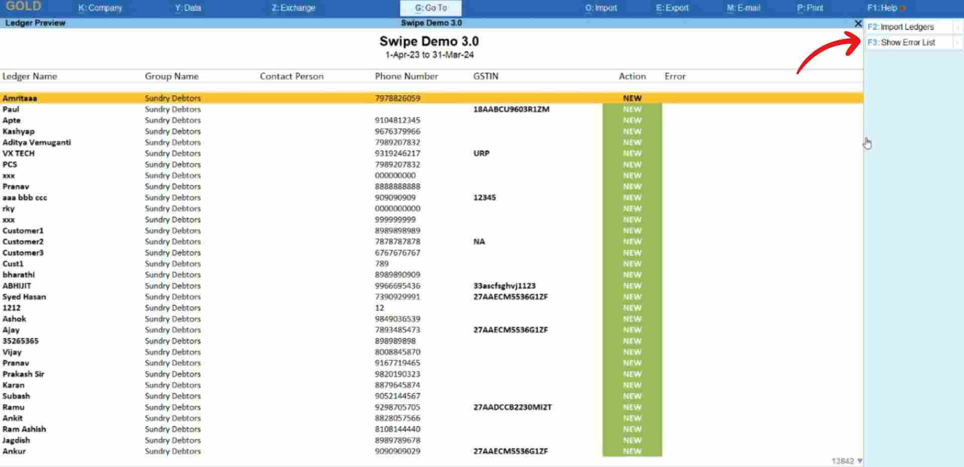 For the error “Ledgers Doesn’t Exist”: Click on the “Import New Ledgers” option present at the top right corner of the screen or press the F4 key on your keyboard.