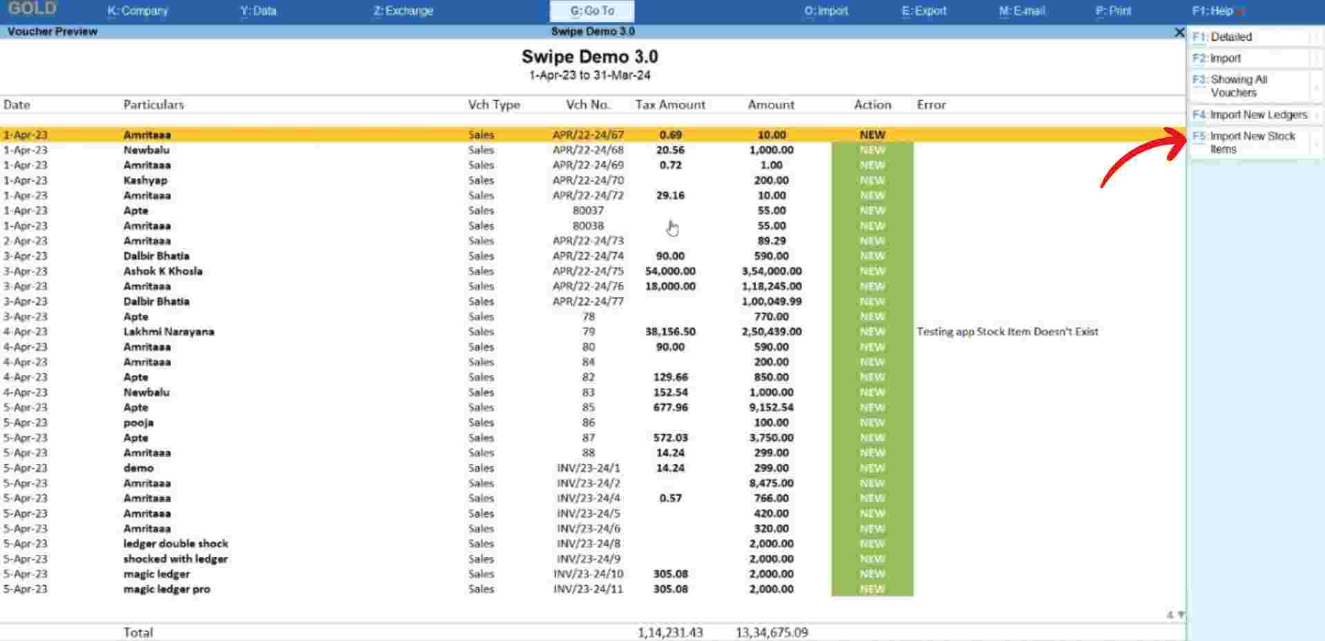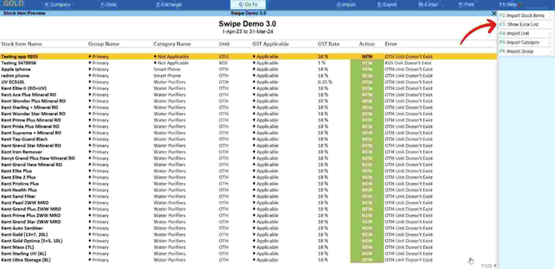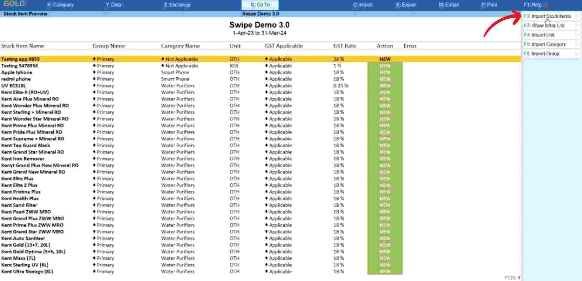 Click on the “Import Stock Items” option present at the top right corner of the screen or press the F3 key on your keyboard.