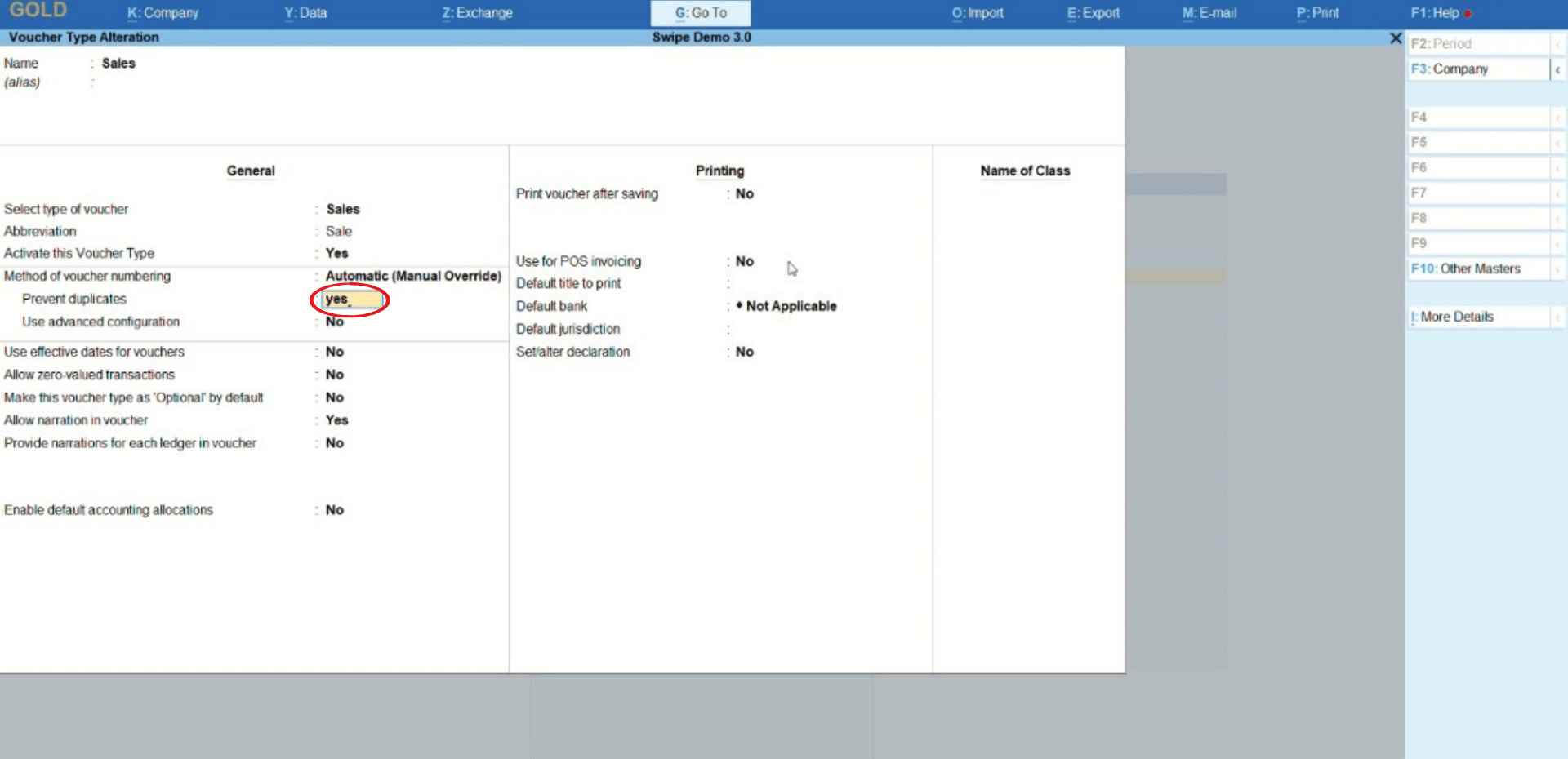 Change “Method of Voucher Numbering” to Automatic (Manual Override).