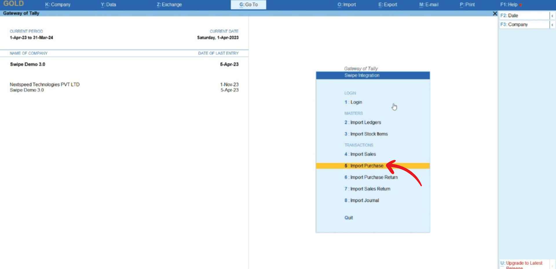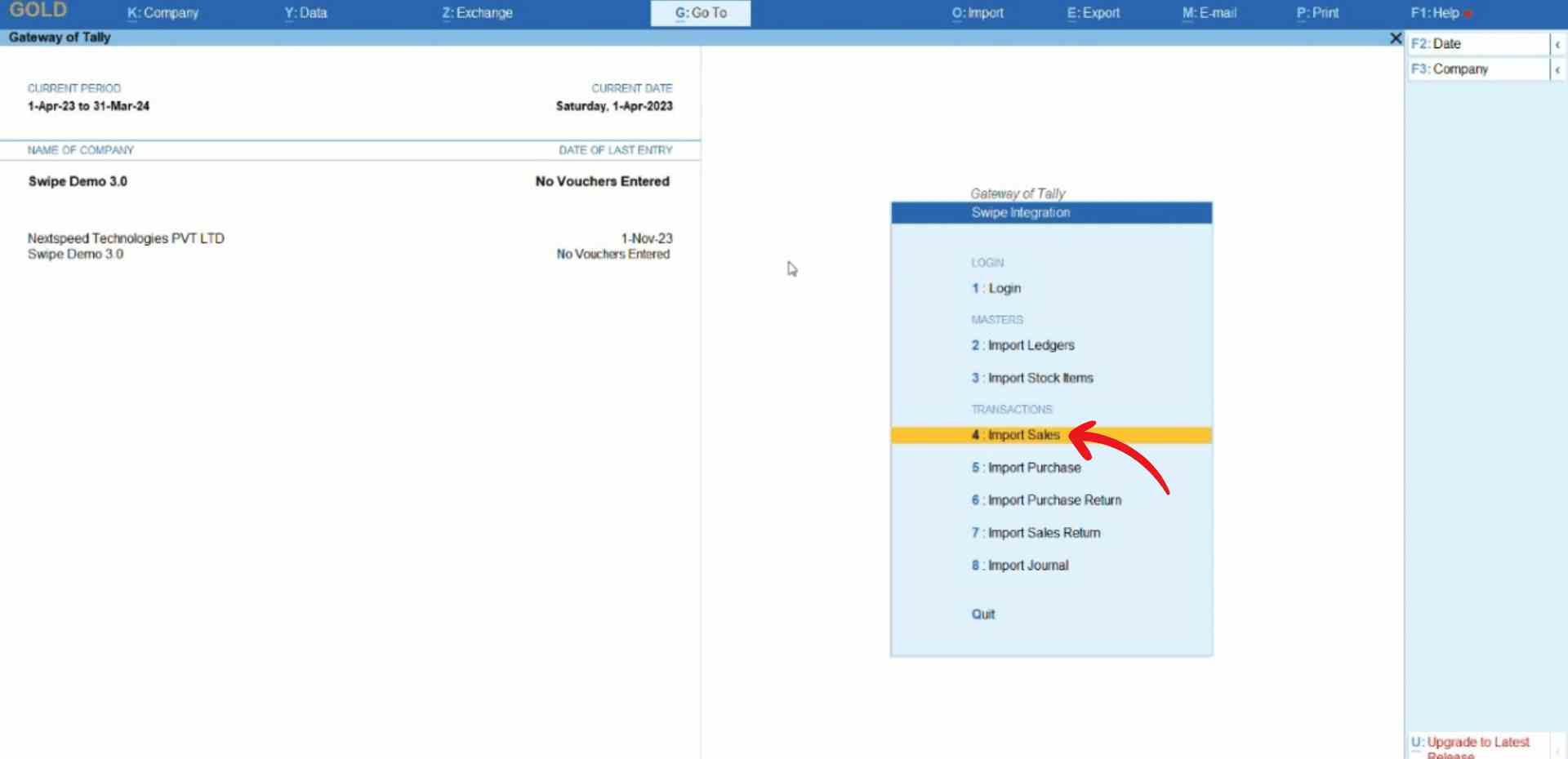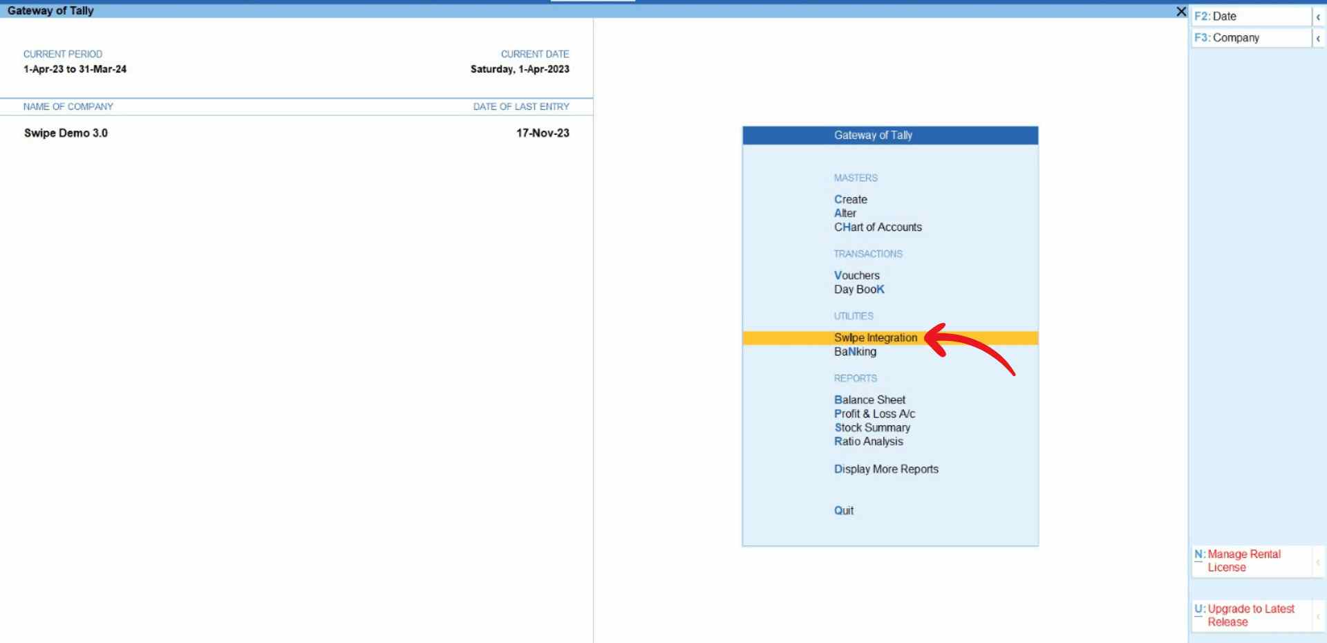 Go to "Swipe Integration" which is under the Utilities section of “Gateway of Tally”.