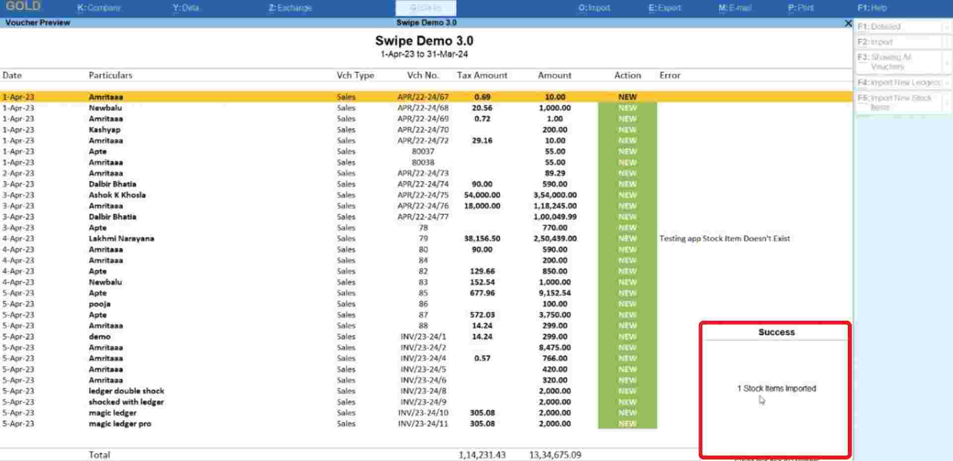 Congratulations, You have successfully imported sales invoice data from your Swipe account to your Tally account, and a pop-up appears at the bottom of the screen informing the same.