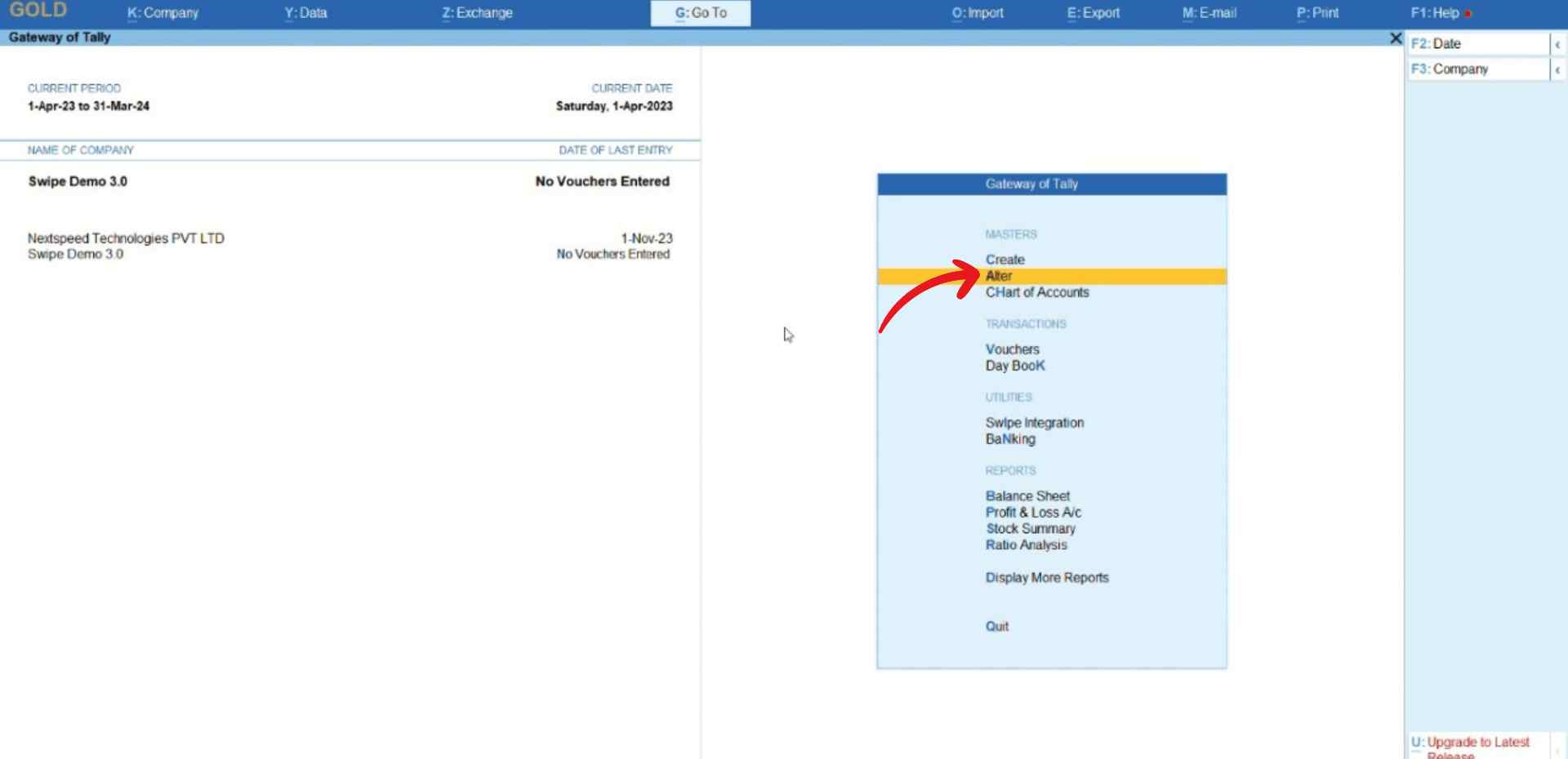 Click on "Atler" which is under the Masters section of “Gateway of Tally”.