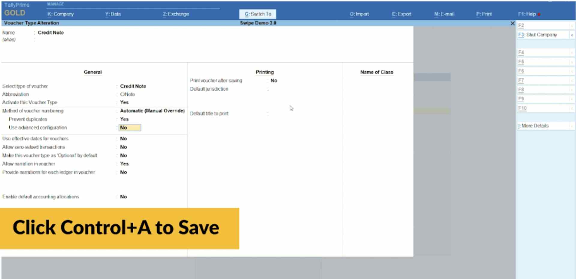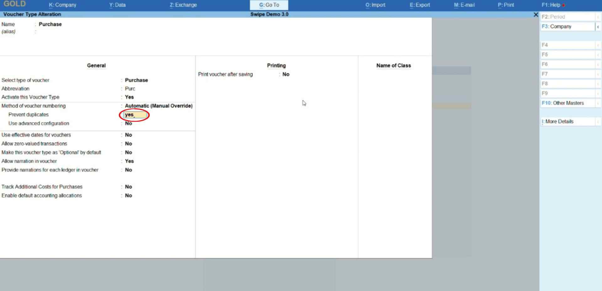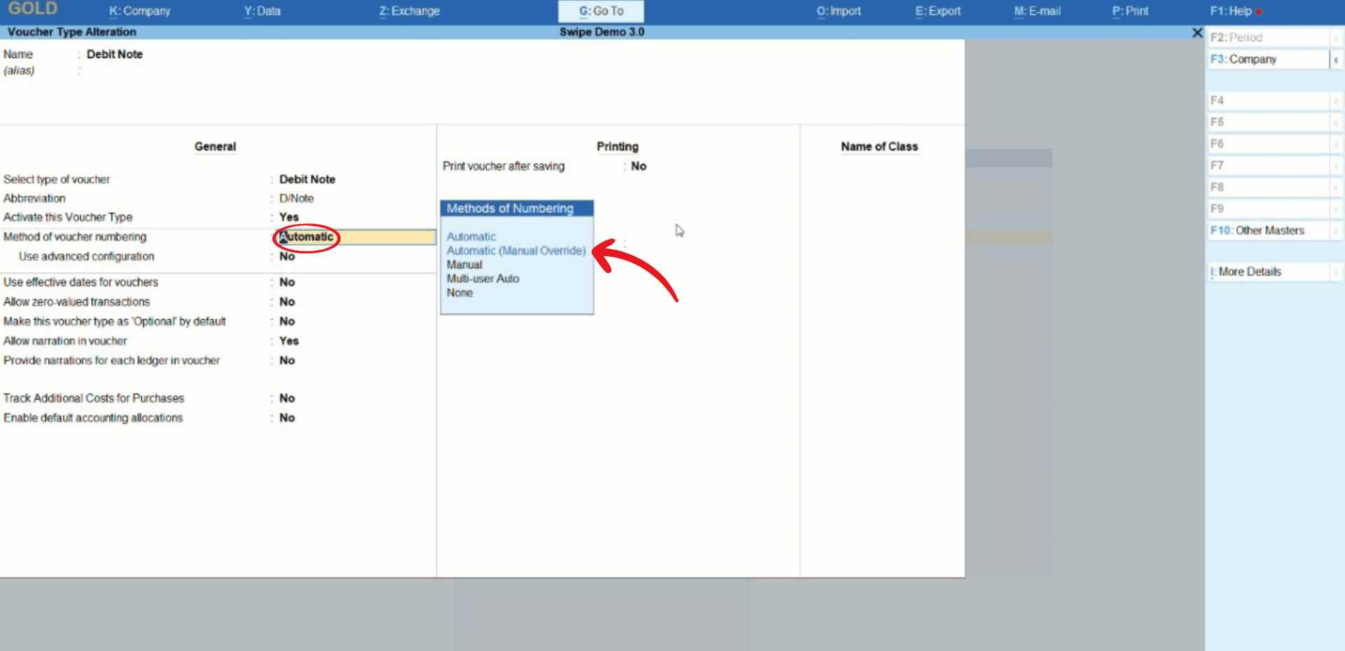 Change “Method of Voucher Numbering” to Automatic (Manual Override)