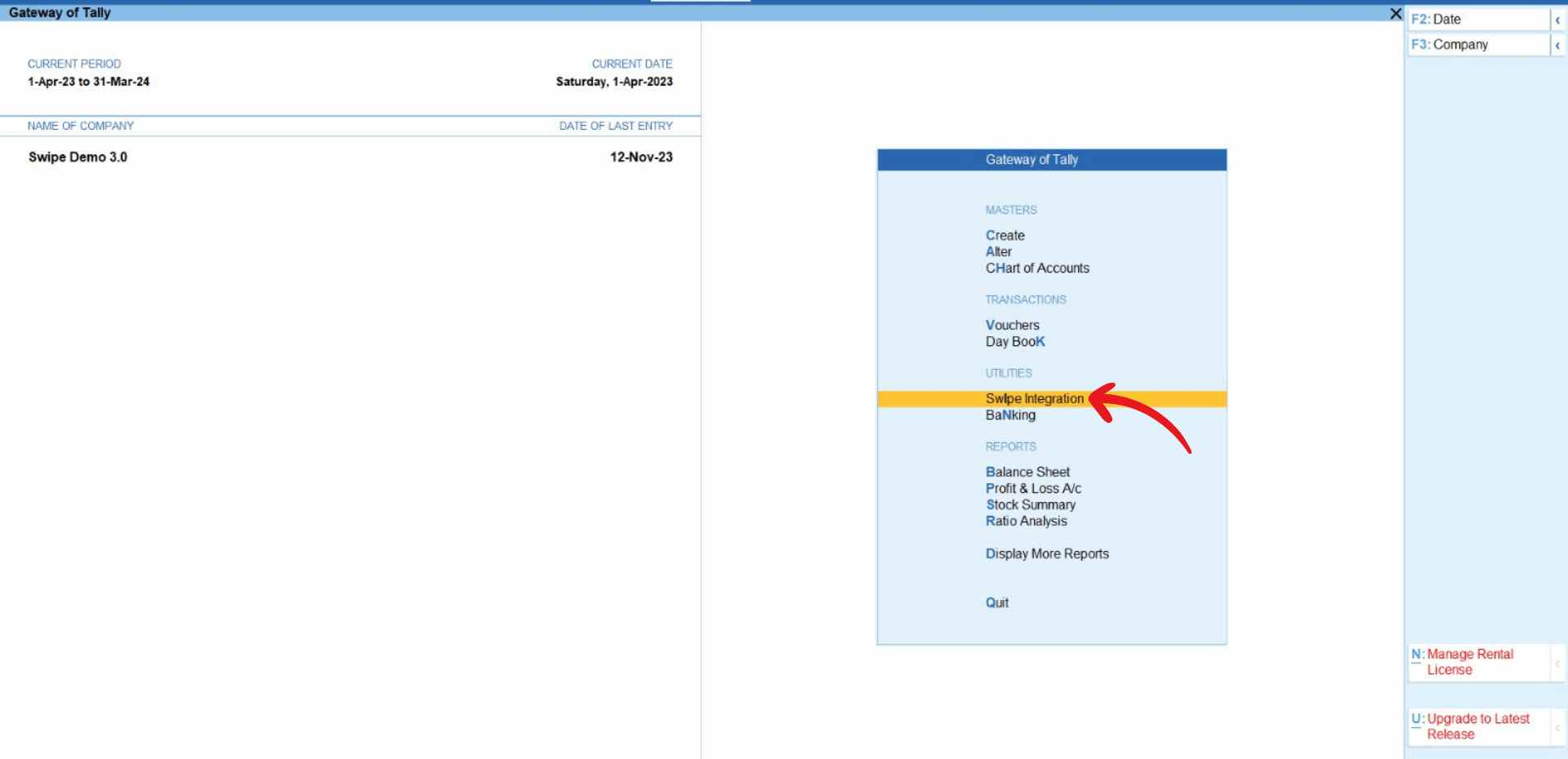 Launch your tally software and click on "Swipe Integration" which is under the Utilities section of “Gateway of Tally”.