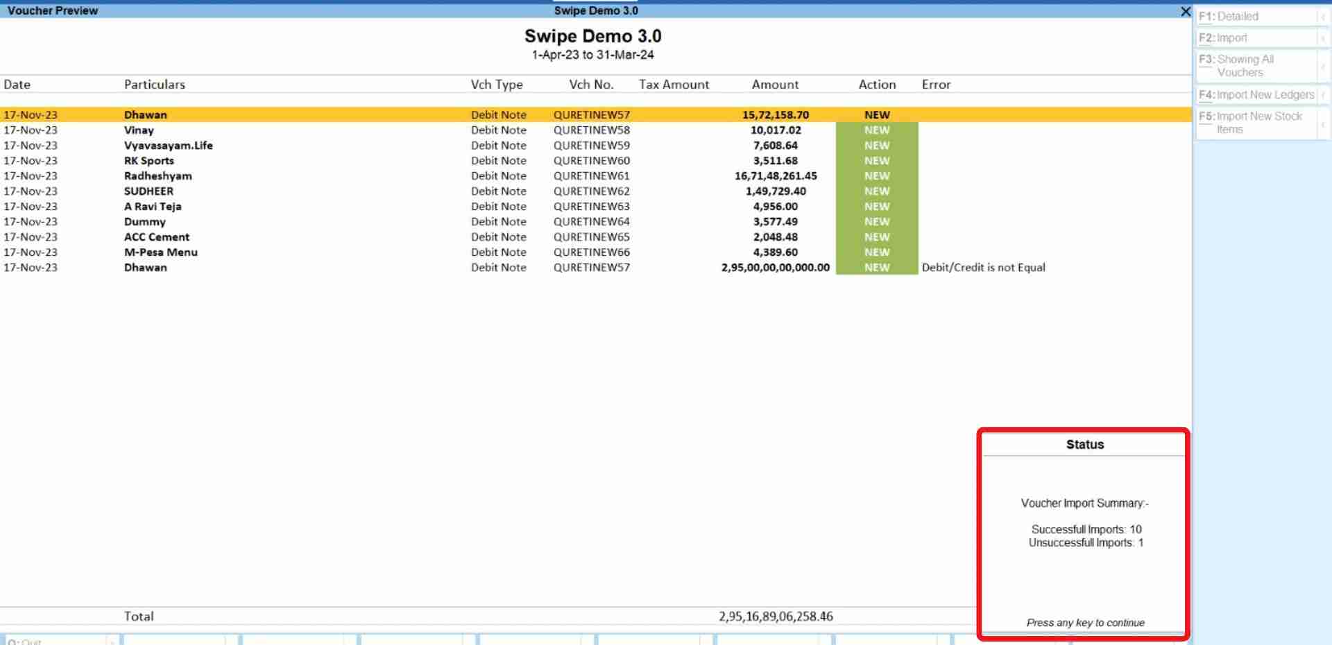 Congratulations, You have successfully imported debit notes data from your Swipe account to your Tally account, and a pop-up appears at the bottom of the screen informing the same.